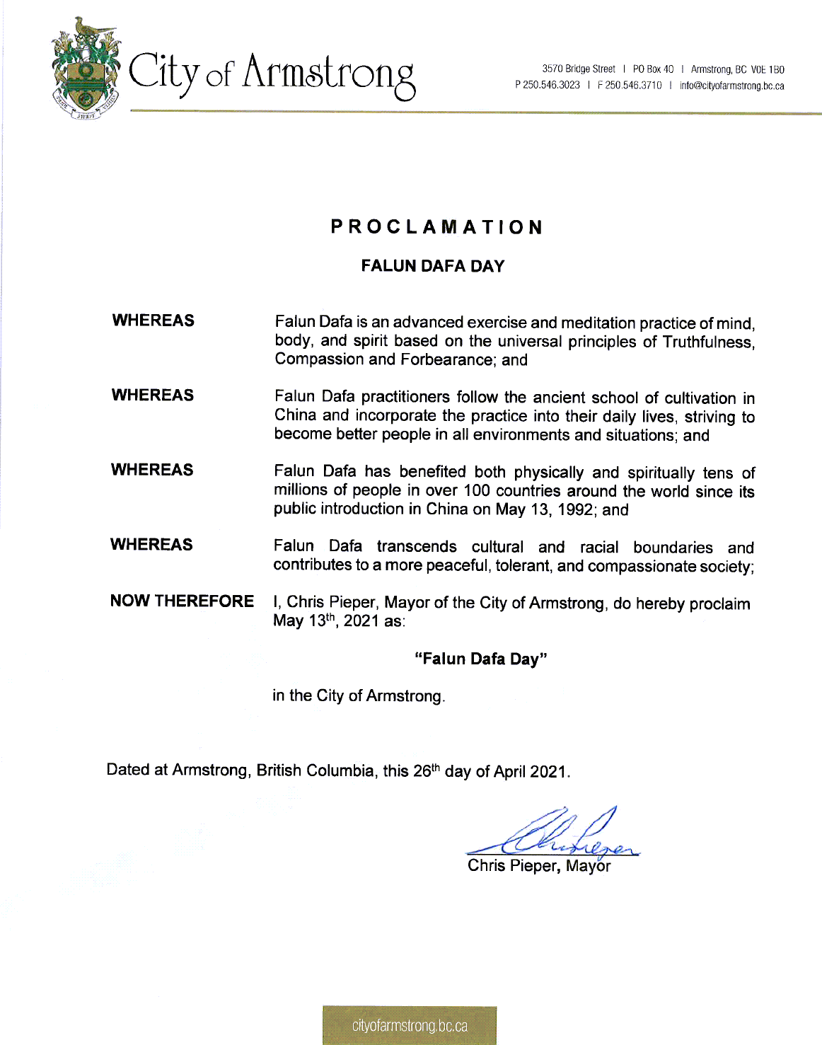 我,阿姆斯特朗市市長克里斯﹒皮珀,特此宣布,二零二一年五月十三日為阿姆斯特朗市「法輪大法日」。