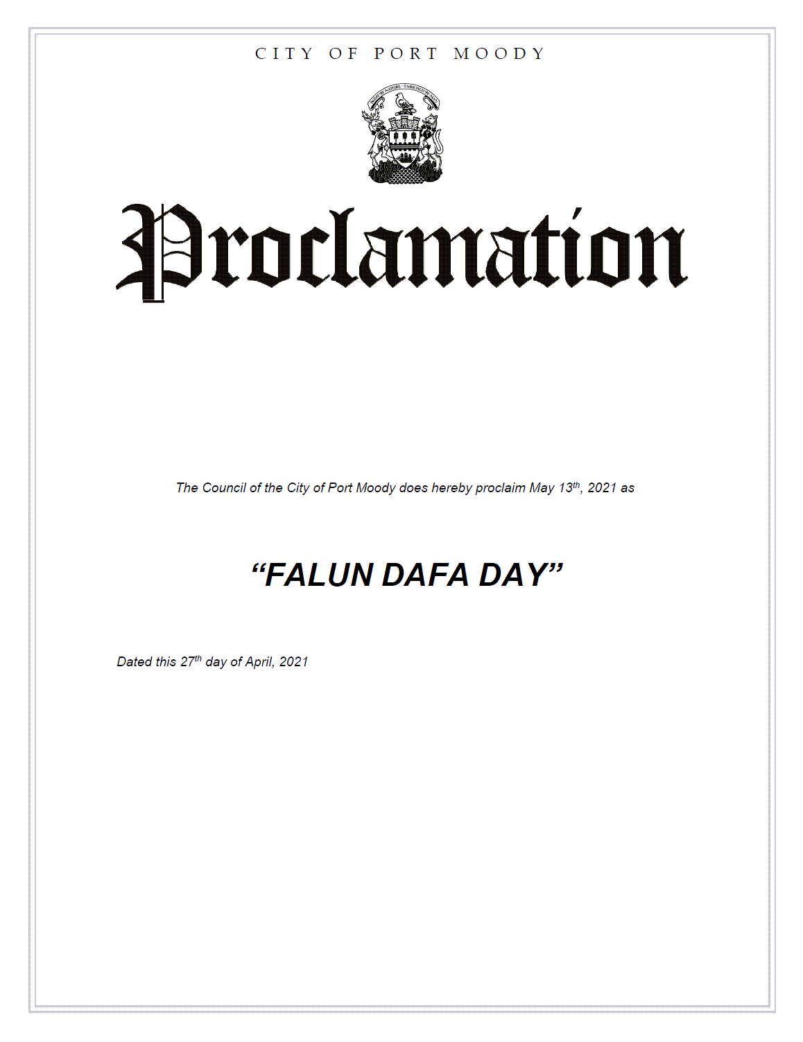 ![]() 圖7:穆迪港市(City of Port Moody)議會宣布二零二一年五月十三日為「法輪大法日」。 |
