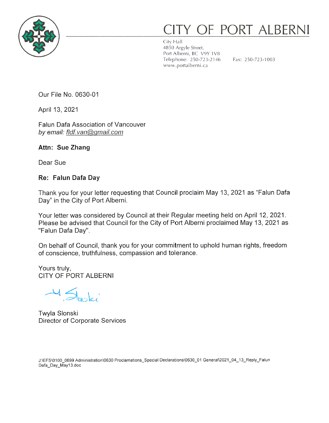 ![]() 圖8:艾伯尼港市(City of Port Alberni)社團服務主任特維拉﹒斯隆斯基(Twyla Slonski)致信溫哥華法輪大法學會:艾伯尼港市議會宣布二零二一年五月十三日為「法輪大法日」。賀信中說:「我代表市議會感謝你們為維護人權與信仰自由,為堅守真、善、忍做出的奉獻。」 |
