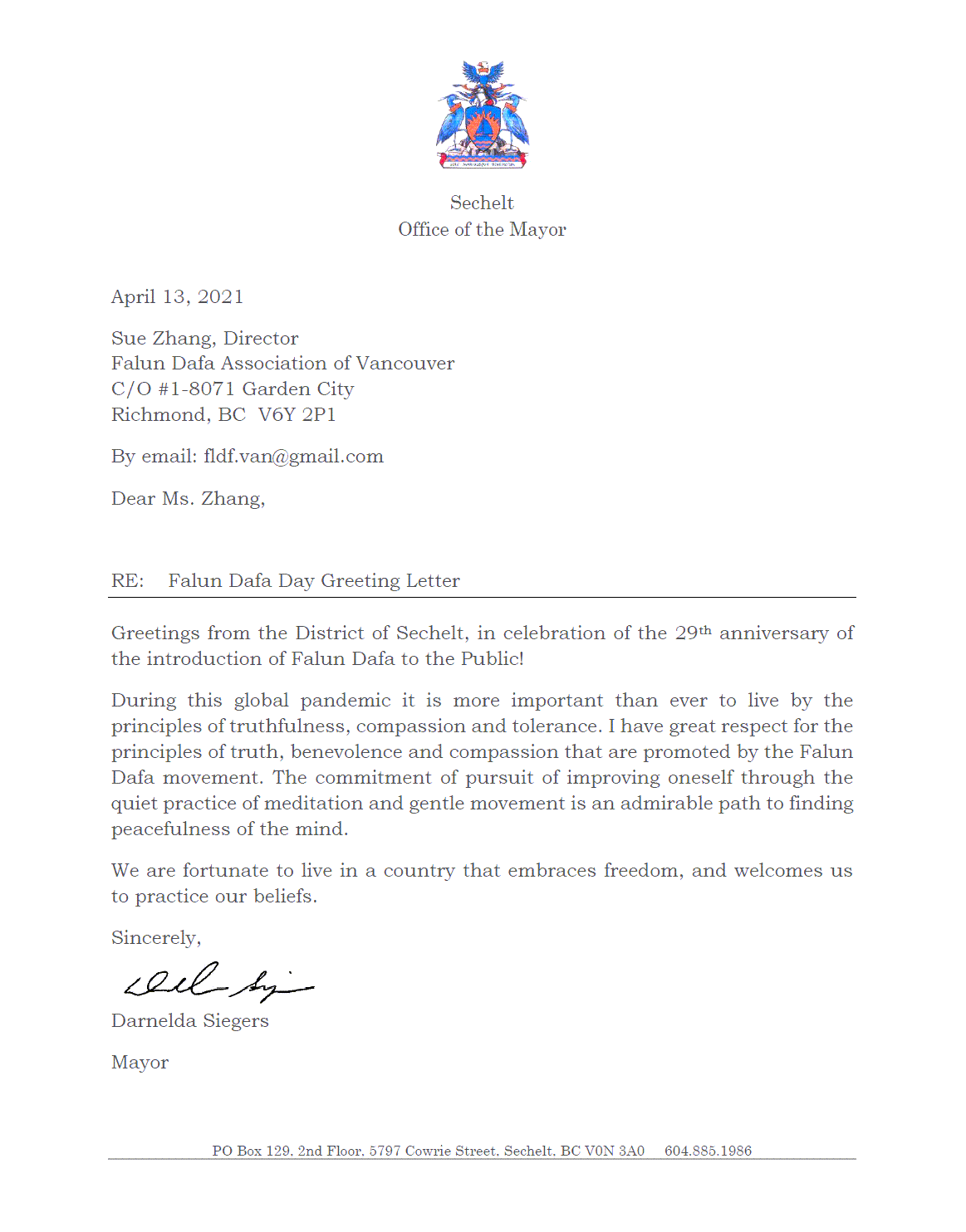 值此慶祝法輪大法公開傳出二十九週年之際,我謹代表錫謝爾特市(Sechelt)表示祝賀。