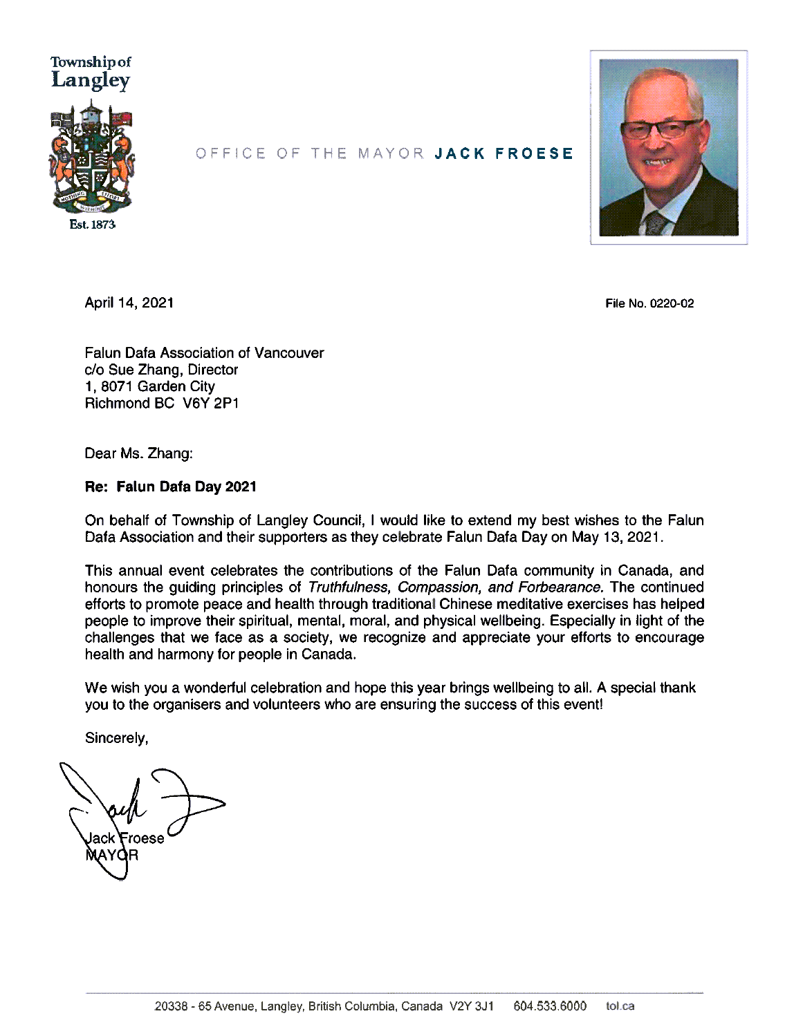 值此慶祝二零二一年五月十三日法輪大法日之際,我謹代表蘭裏鎮(Township of Langley)市議會向溫哥華法輪大法學會及其支持者們致以最良好的祝願。