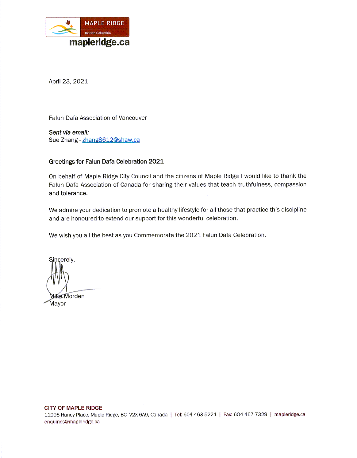 我謹代表楓樹嶺市(Maple Ridge)市議會和楓樹嶺市民,向加拿大法輪大法學會表達我們的謝意。感謝你們與我們分享你們的真、善、忍價值觀。