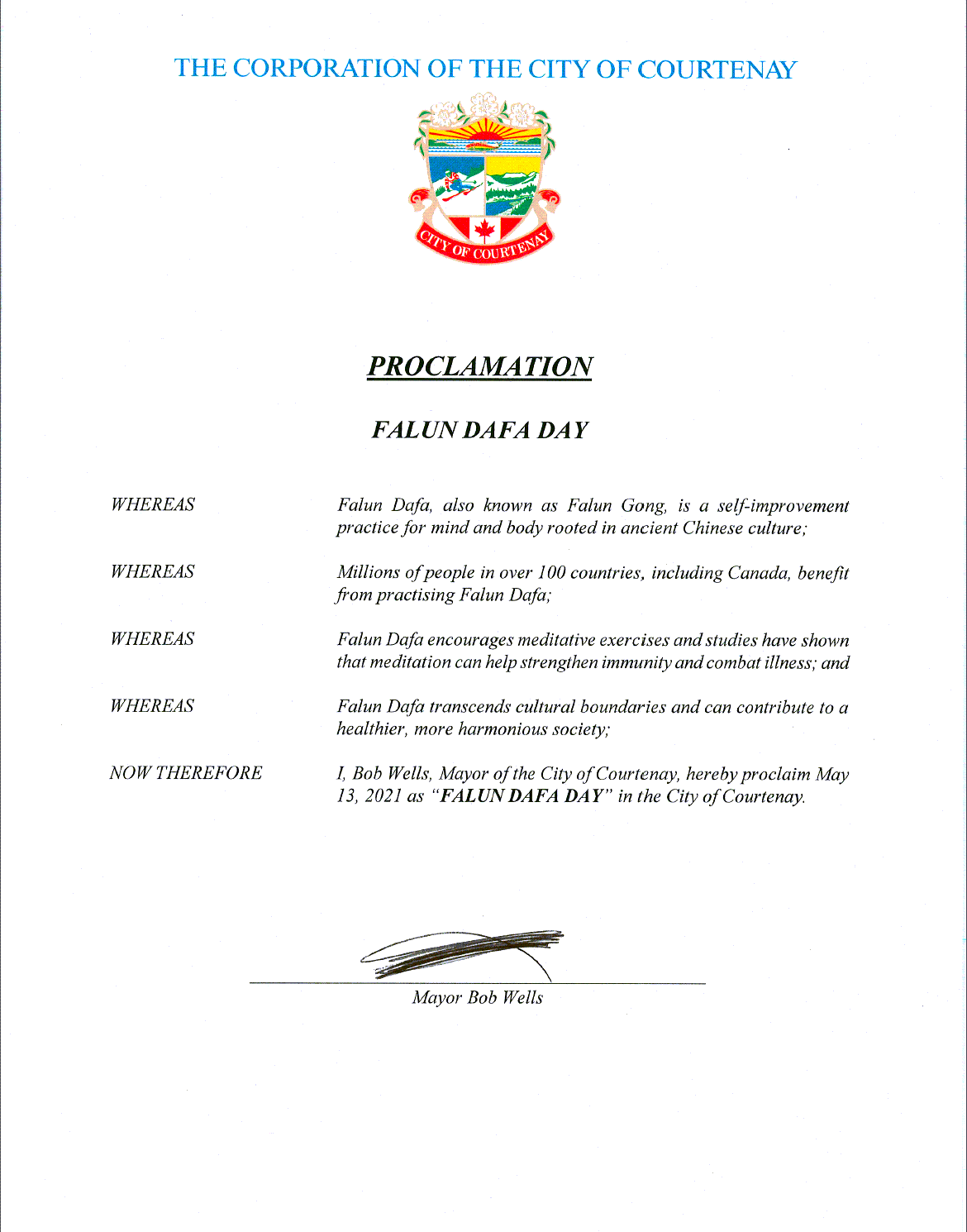 我,鮑勃﹒韋爾斯(Bob Wells),考特尼市市長,特此宣布二零二一年五月十三日為考特尼市「法輪大法日」。