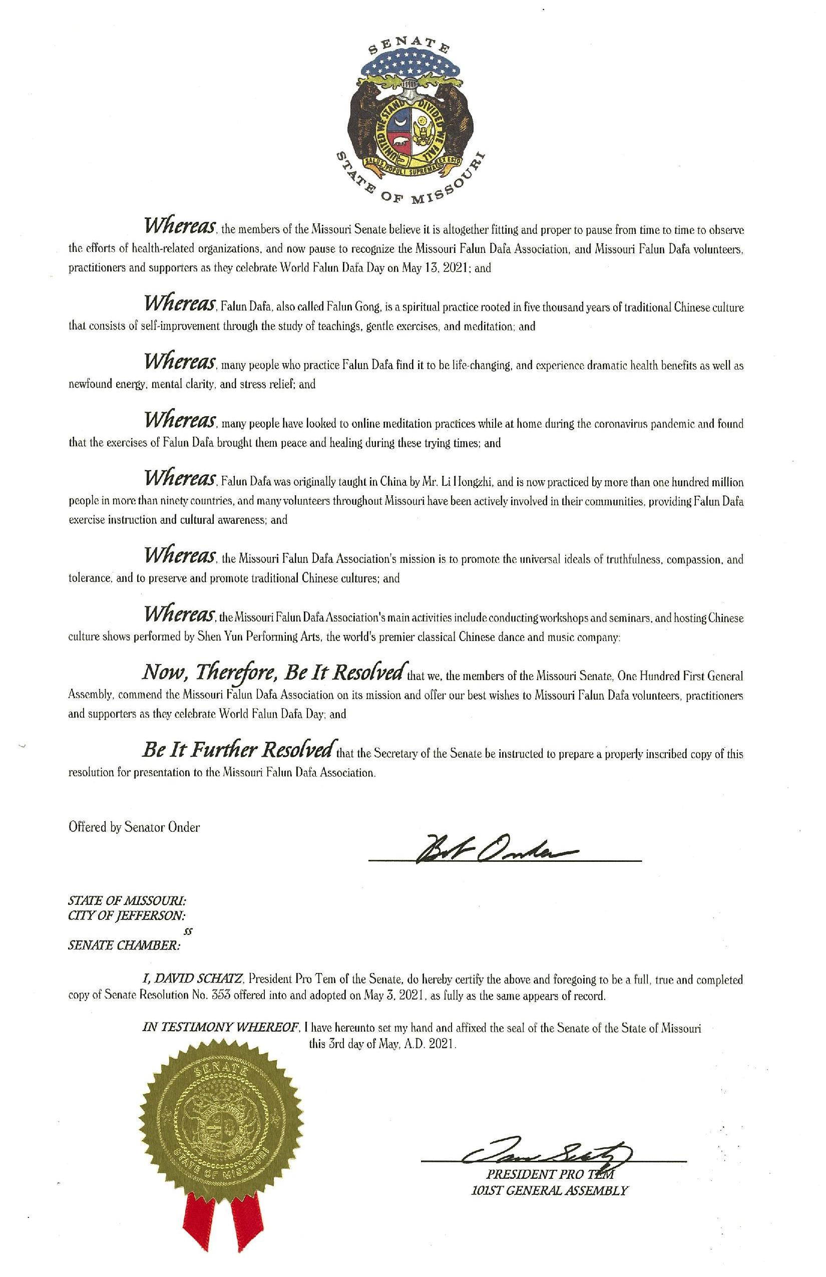 鑑於,密蘇裏州參議院的議員們認為應該適當的表彰和健康相關的有關機構,值此二零二一年五月十三日慶祝世界法輪大法日之際,我們向密蘇裏州法輪大法學會及其義工、學員及支持者們致意;