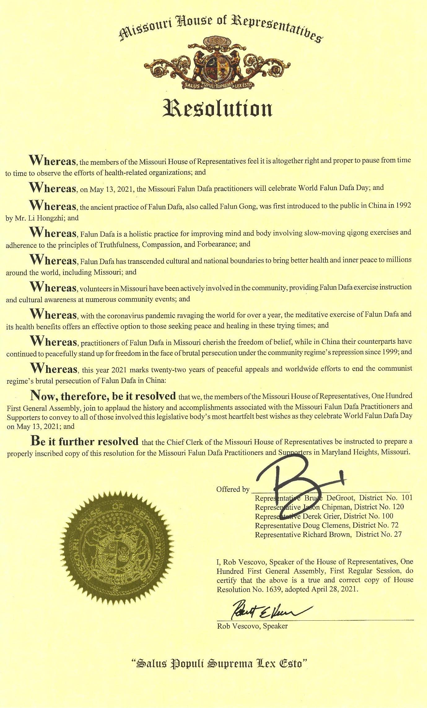 決議案中說,「我們,密蘇裏州眾議院第一百零一屆議會的議員們,向密蘇裏州法輪大法修煉者在過去取得的成就表示祝賀。向所有在五月十三日慶祝世界法輪大法日的人們表示最衷心最良好的祝願。」