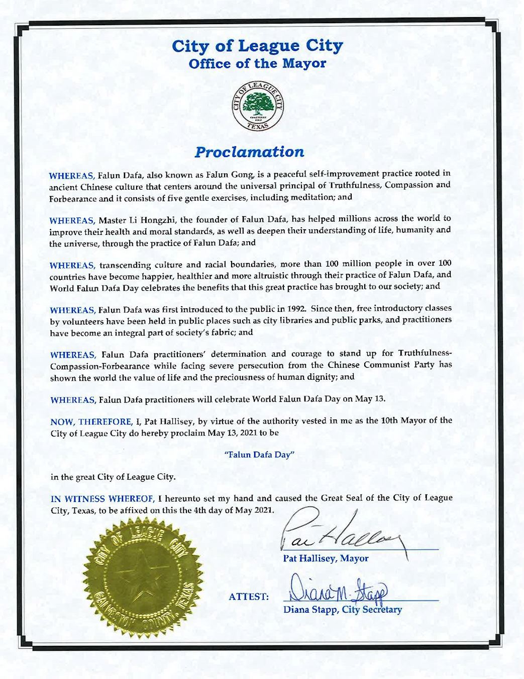 因此,我,派特﹒哈里斯 (Pat Hallisey),憑借我里格城第十任市長的權力,特此宣布二零二一年五月十三日,為「法輪大法日」 。