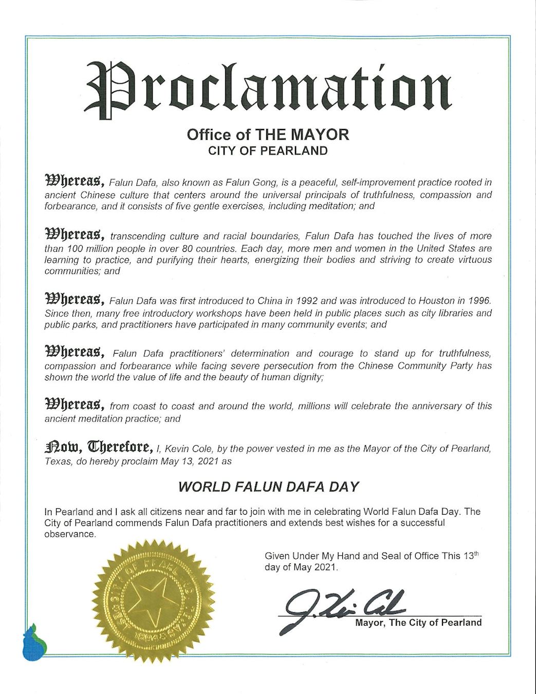 因此,我, 凱文﹒科爾 (Kevin Cole),作為德州梨園市長,特此宣布二零二一年五月十三日,為「世界法輪大法日」 。