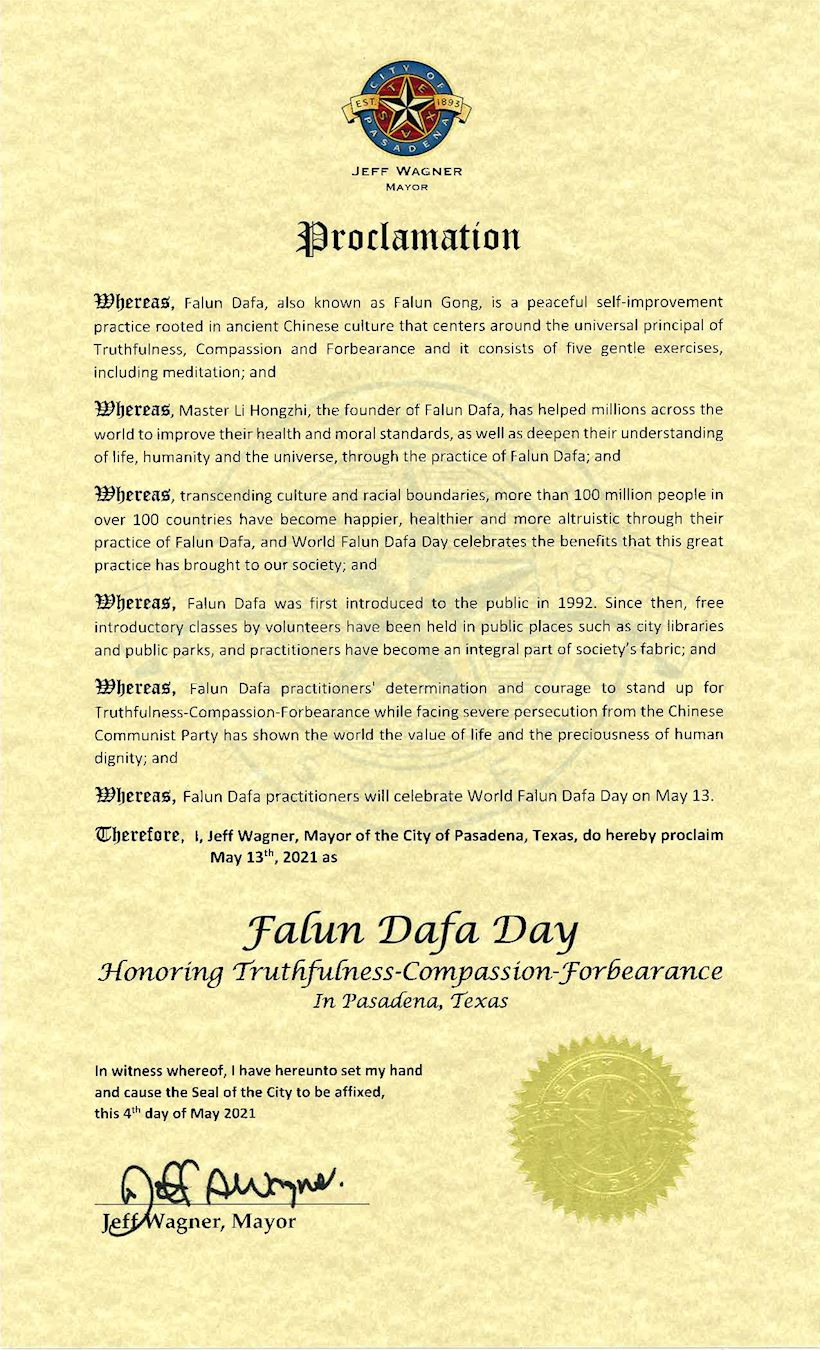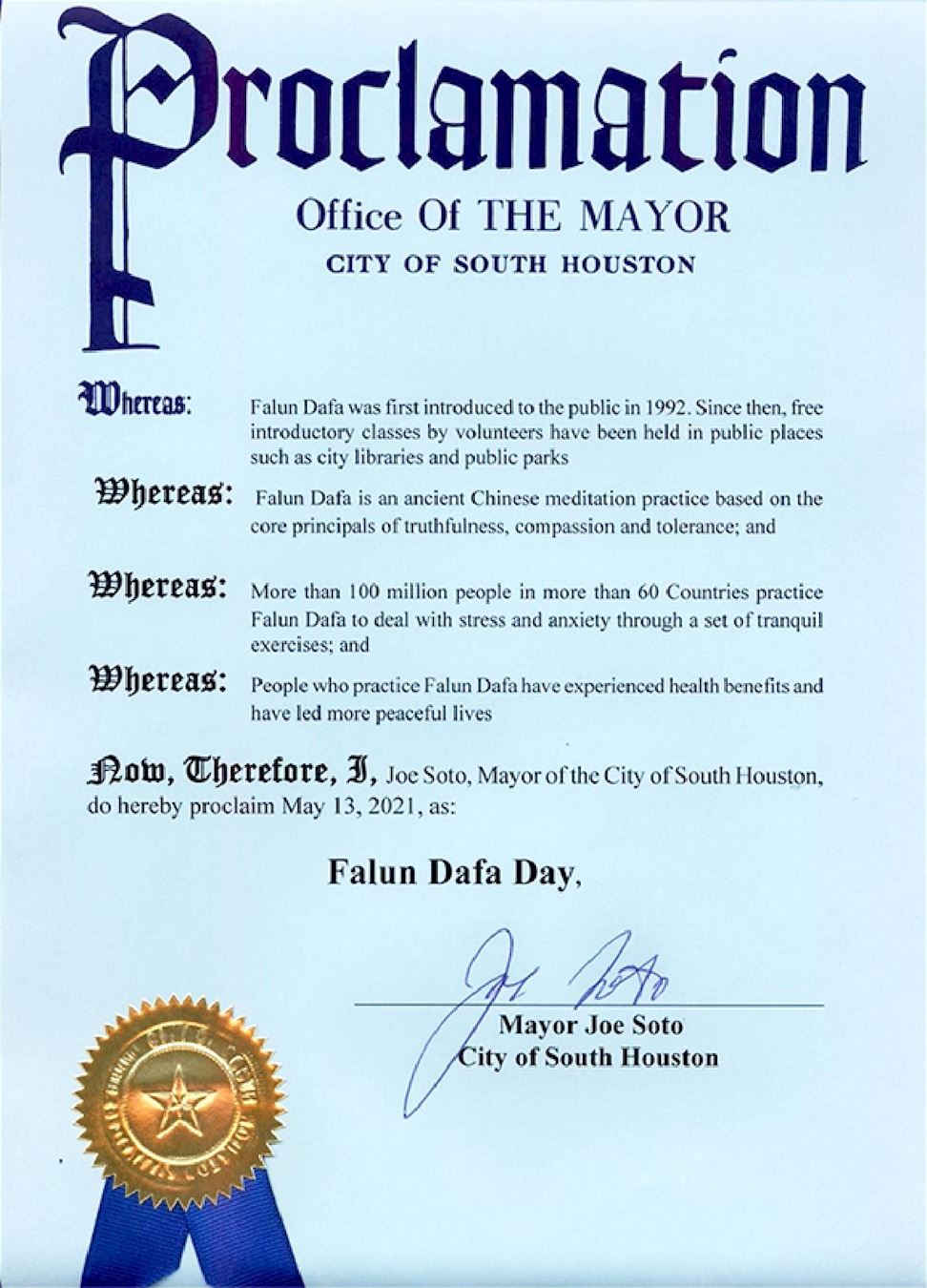 因此,我,喬﹒索托,作為南休士頓市長,特此宣布2021年5月13日,為「法輪大法日」。