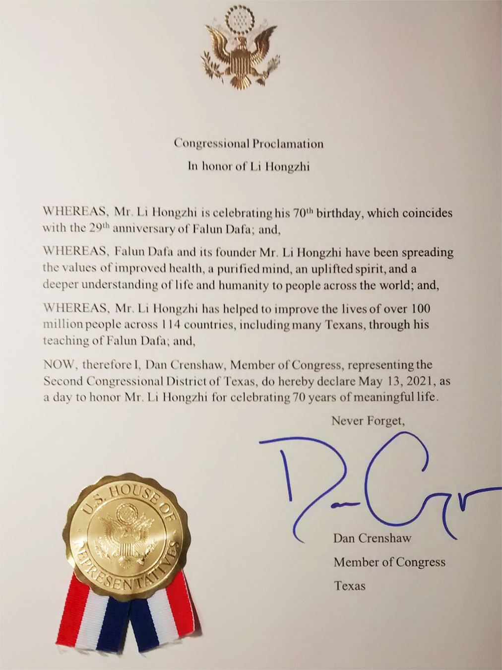 國會議員丹﹒克倫肖(Dan Crenshaw)頒發的褒獎譯文如下: