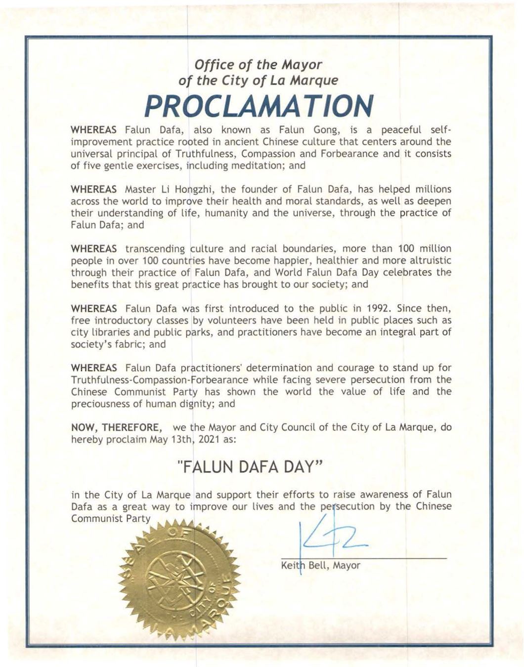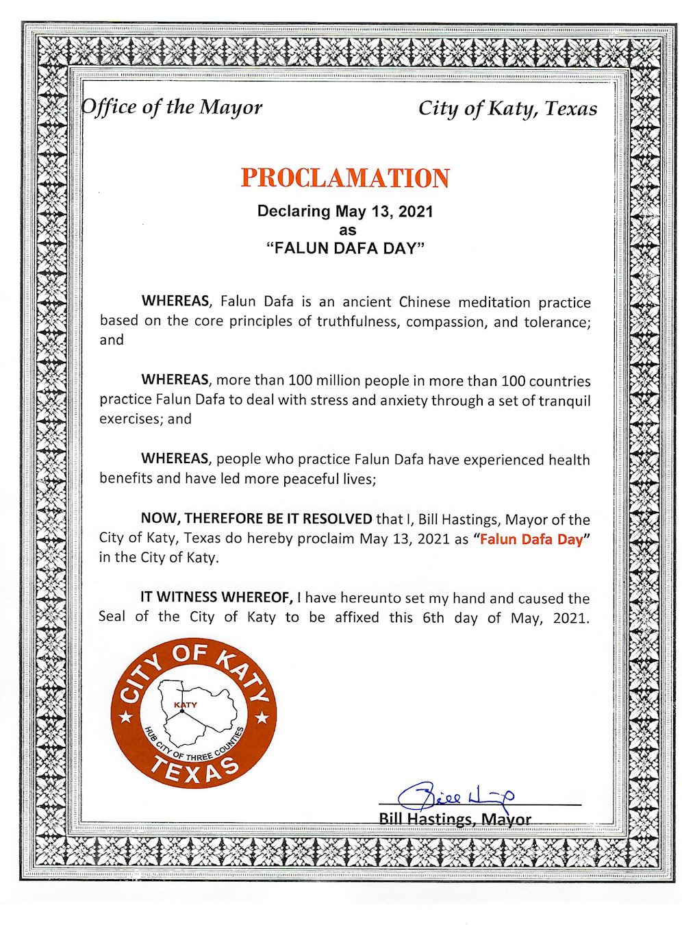 鑑此,德克薩斯州凱蒂市市長比爾﹒黑斯廷斯(Bill Hastings)謹在此宣布二零二一年五月十三日為凱蒂市的 「法輪大法日」。