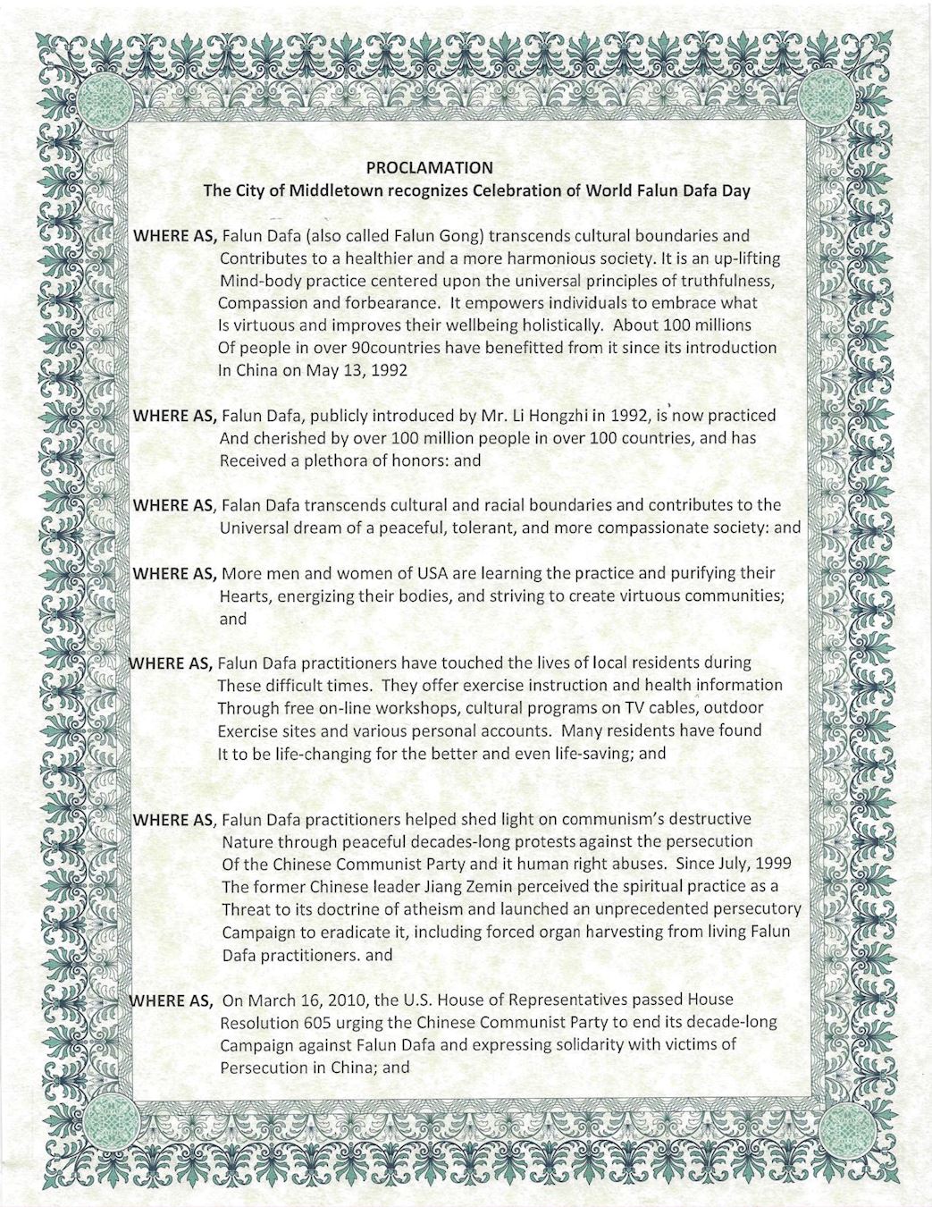 米德爾敦市(City of Middletown)嘉獎世界法輪大法日
