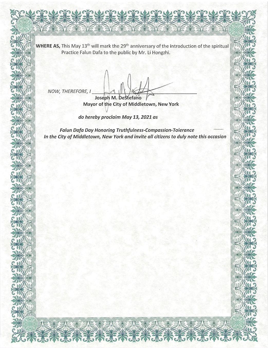 紐約州橙縣米德爾敦市(City of Middletown)市長約瑟夫﹒德斯特法諾(Joseph M. DeStefano)宣告二零二一年五月十三日為紐約州米德爾敦市法輪大法日,頌揚真、善、忍,並相邀所有市民關注此盛事。