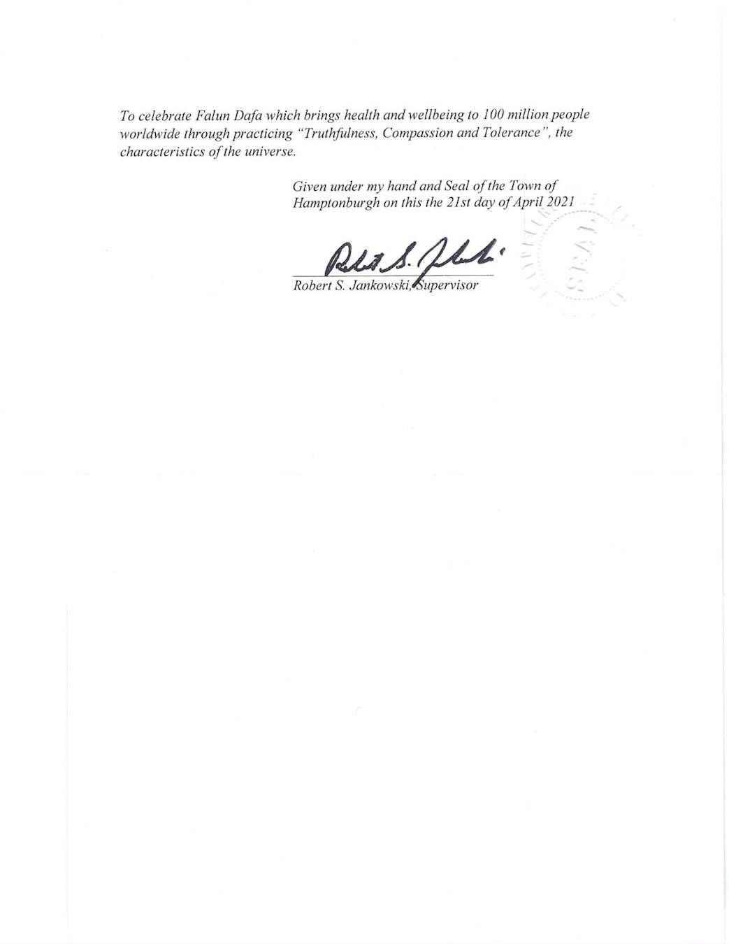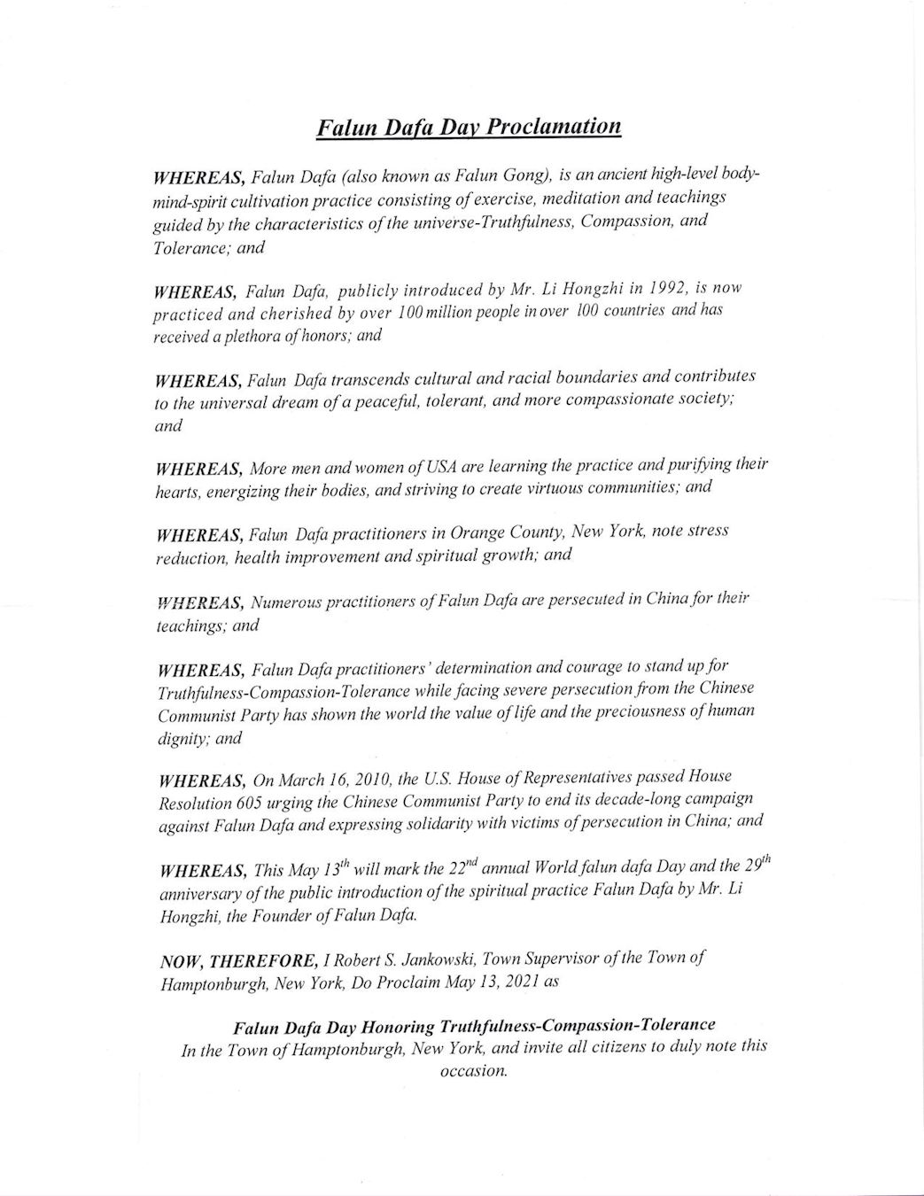 紐約州橙縣漢普頓堡鎮(Hamptonburgh)鎮長羅伯特﹒揚科夫斯基(Robert S. Jankowski)宣告二零二一年五月十三日為紐約州普頓堡鎮法輪大法日,並相邀所有市民屆時關注此盛事,慶賀法輪大法給全世界上億人民通過實踐真、善、忍宇宙特性所帶來的健康和福份。