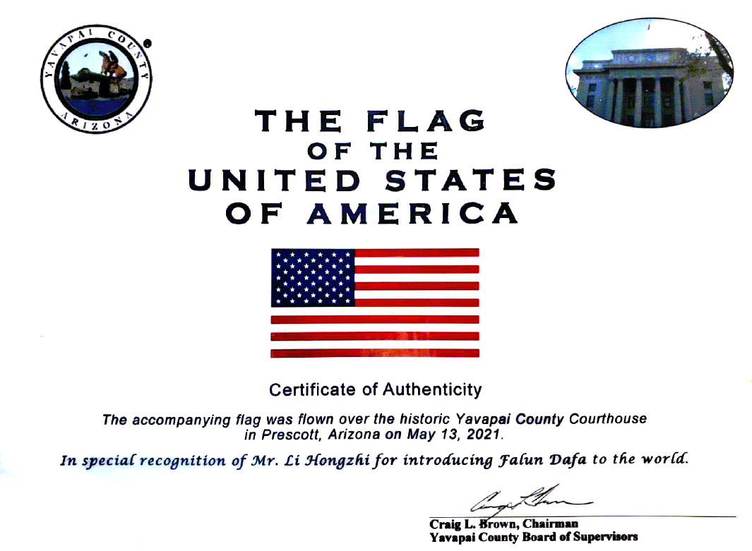與此同時,亞利桑那州亞瓦派縣 (Yavapai County)在五月十三日升旗,讚譽與認可李洪志先生將法輪大法洪傳世界。
