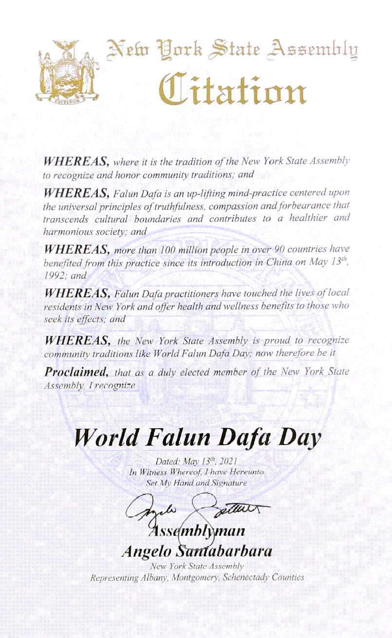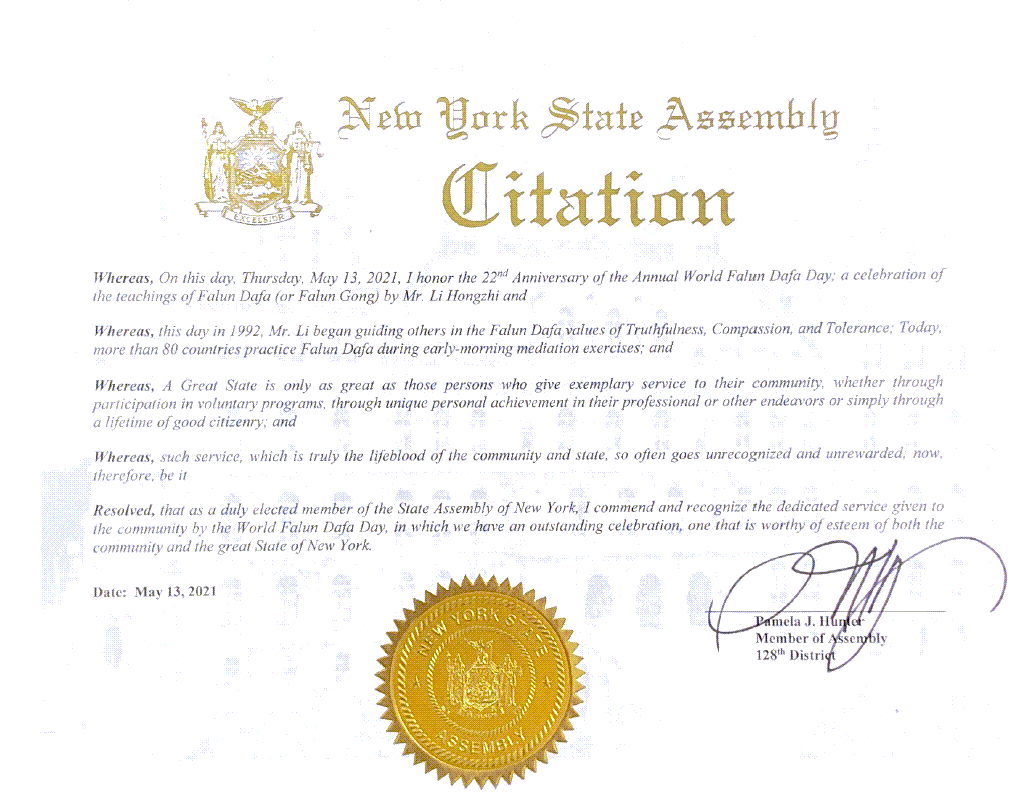 茲決定,作為紐約州議會的正式當選議員,我讚揚世界法輪大法日為社區提供的熱誠服務,慶祝活動非常出色,值得我們社區和偉大的紐約州的尊敬。