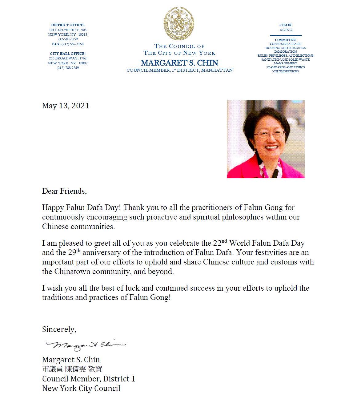 ![]() 圖2:紐約市第一選區市議員陳倩文(Margaret S. Chin)發來賀信,祝賀法輪功的朋友們節日快樂。 |