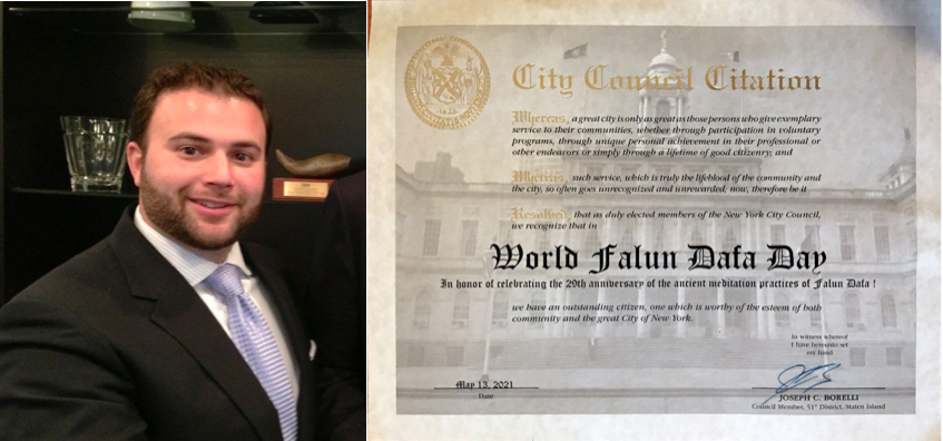 ![]() 圖3:紐約市第五十一選區市議員約瑟夫﹒博雷利(Joseph C. Borelli)祝賀世界法輪大法日。 |