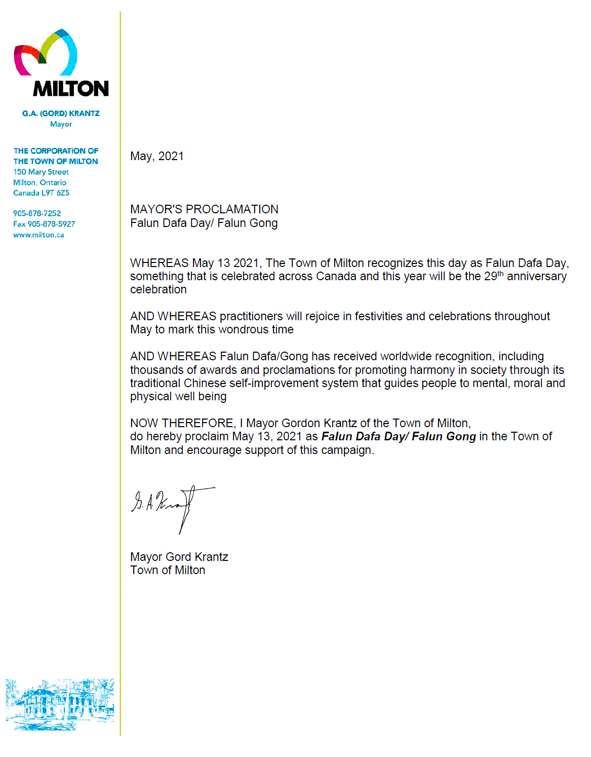 我,密爾頓市長戈登﹒克蘭茨在此宣布2021年5月13日為「米爾頓市法輪大法日」,並鼓勵大家支持這一活動。