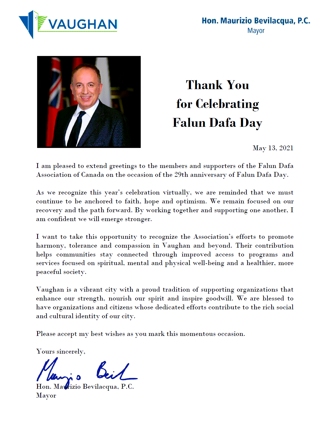 安省大多倫多地區旺市(Vaughan)市長毛裏齊奧﹒貝維拉瓜(Maurizio Bevilacqua)發出賀信稱:我非常高興能在法輪大法洪傳29週年之際,向加拿大法輪大法學會的成員們和支持者表達我的問候。