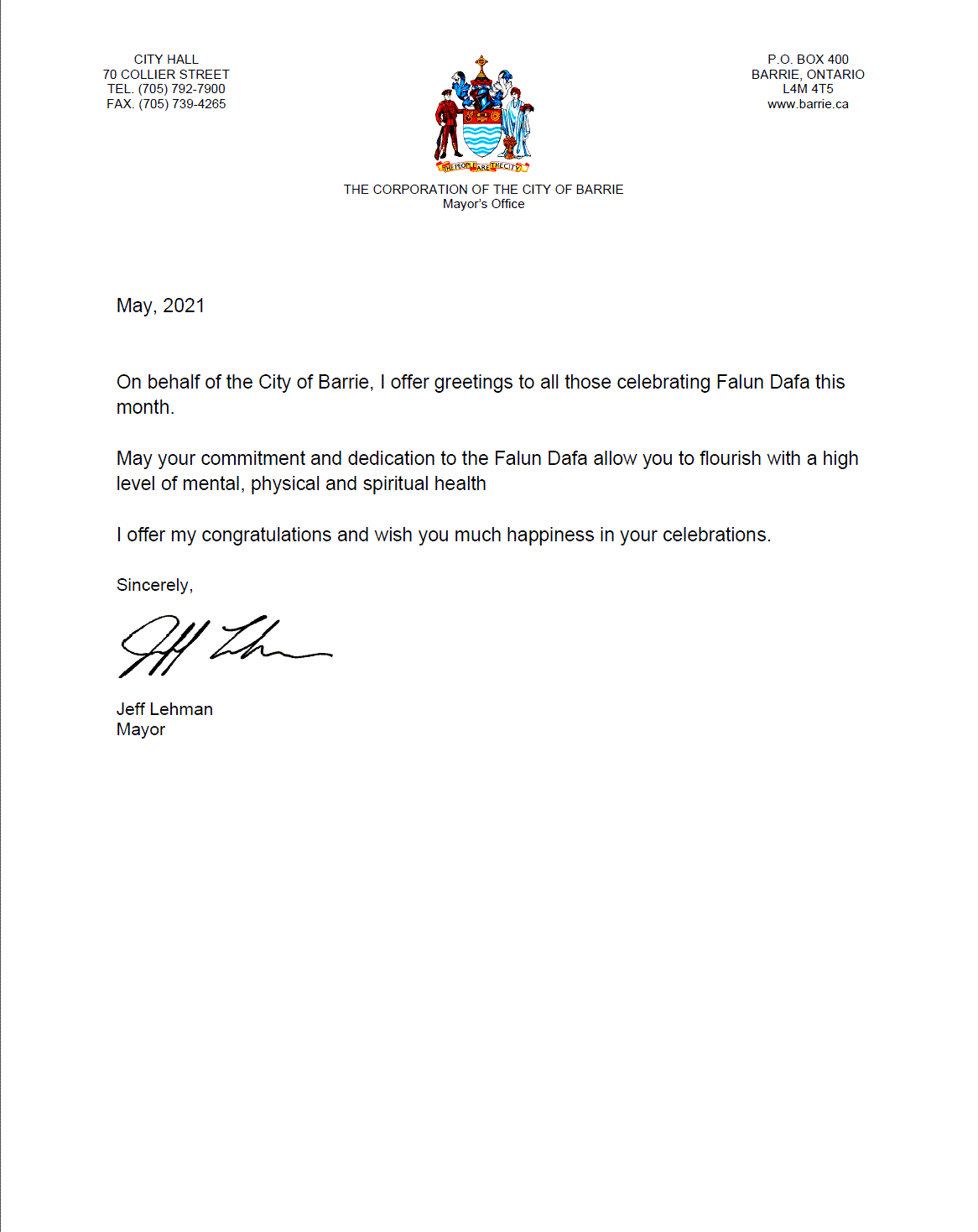 安省巴裏市(Barrie)市長傑夫﹒雷曼(Jeff Lehman)的賀信:我代表巴裏市向祝賀法輪大法日的所有人表示問候。願你們對法輪大法的堅守和實踐為你們帶來身心靈的不斷提升。祝賀慶典成功。