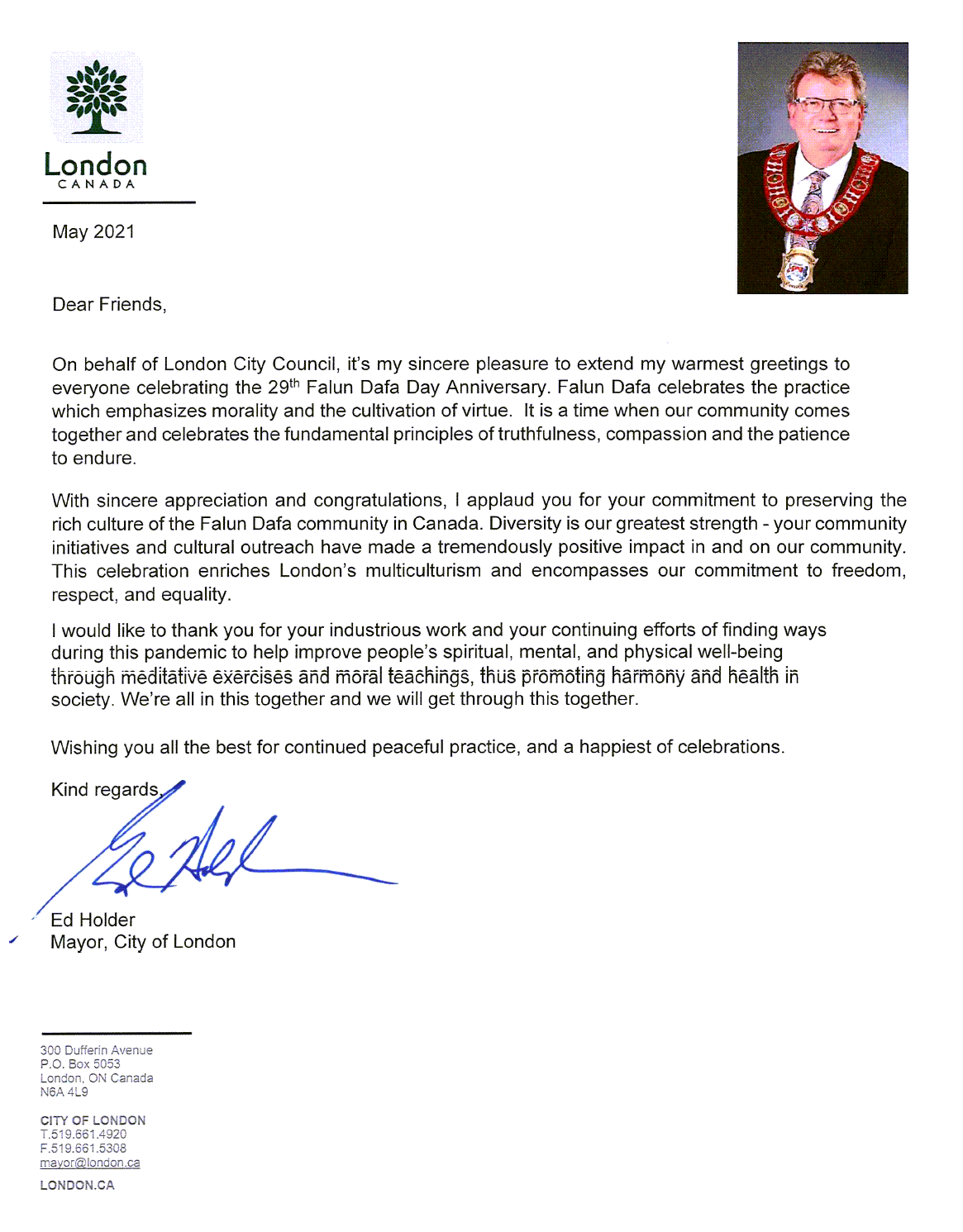心懷由衷的熱情與自豪,我為你們在加拿大保護及傳承法輪大法的豐富文化而喝彩。多元是我們最大的優勢。(法輪大法的)活動與文化推廣對我們的社區產生了巨大的正面影響。這次慶祝活動豐富了倫敦市的多元文化,並凸顯了我們對自由、尊重、平等的弘揚。