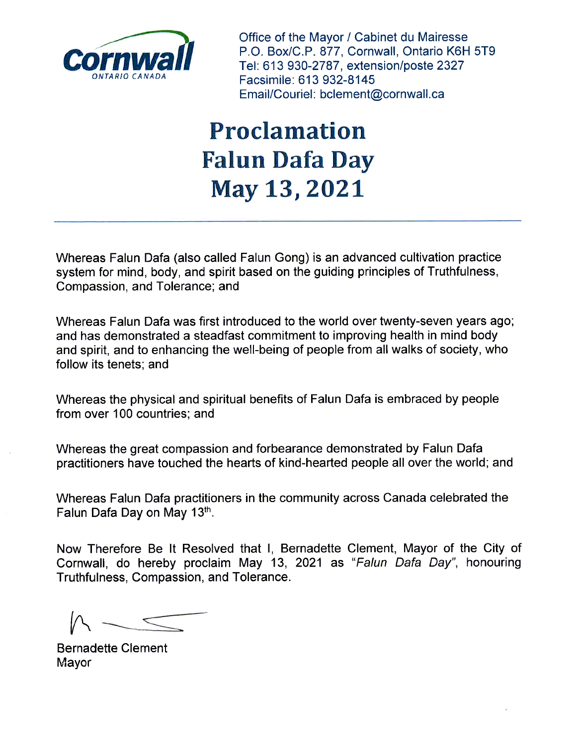 鑑於全加拿大的法輪大法修煉者普天同慶5月13日的法輪大法日,現茲決議,我本人,Bernadette Clement,作為康沃爾市市長,正式宣布2021年5月13日為「法輪大法日」,褒獎「真、善、忍」。