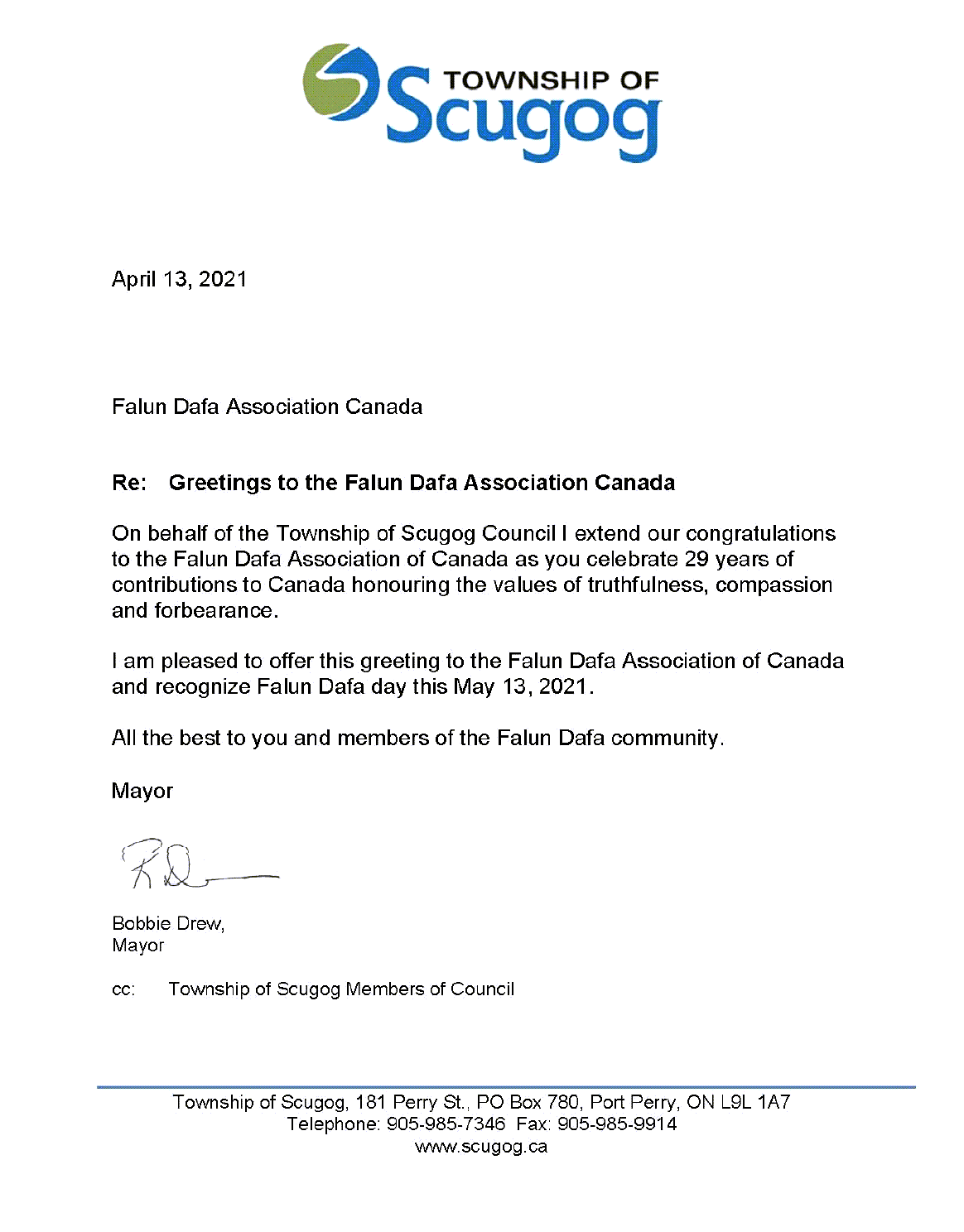 安省施古克鎮(Scugog)鎮長鮑比﹒德魯(Bobbie Drew)的賀信:我代表市議會,向29年來致力於弘揚真善忍價值,奉獻加拿大社會的法輪大法協會致以問候。在2021年5月13日之際,向法輪大法協會以及法輪大法成員送上最美好的祝願。