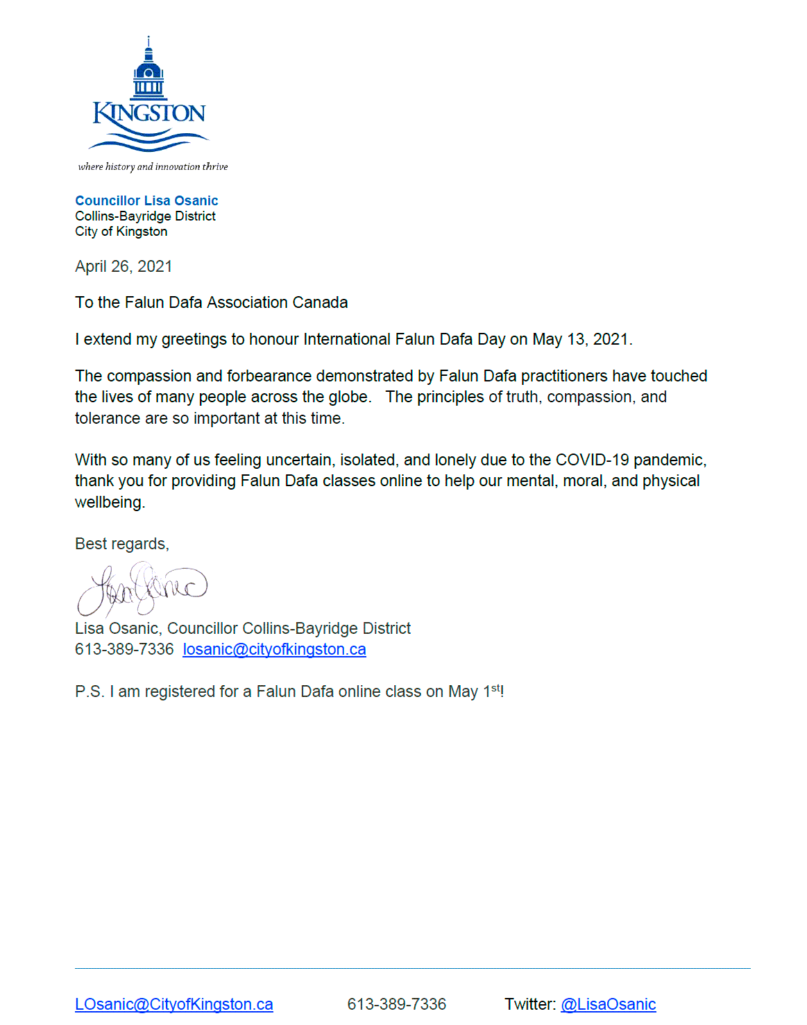 安省金斯頓市(Kingston)市議員麗莎﹒奧薩尼奇(Lisa Osanic)的賀信寫著:我向2021年5月13日世界法輪大法日致以問候。