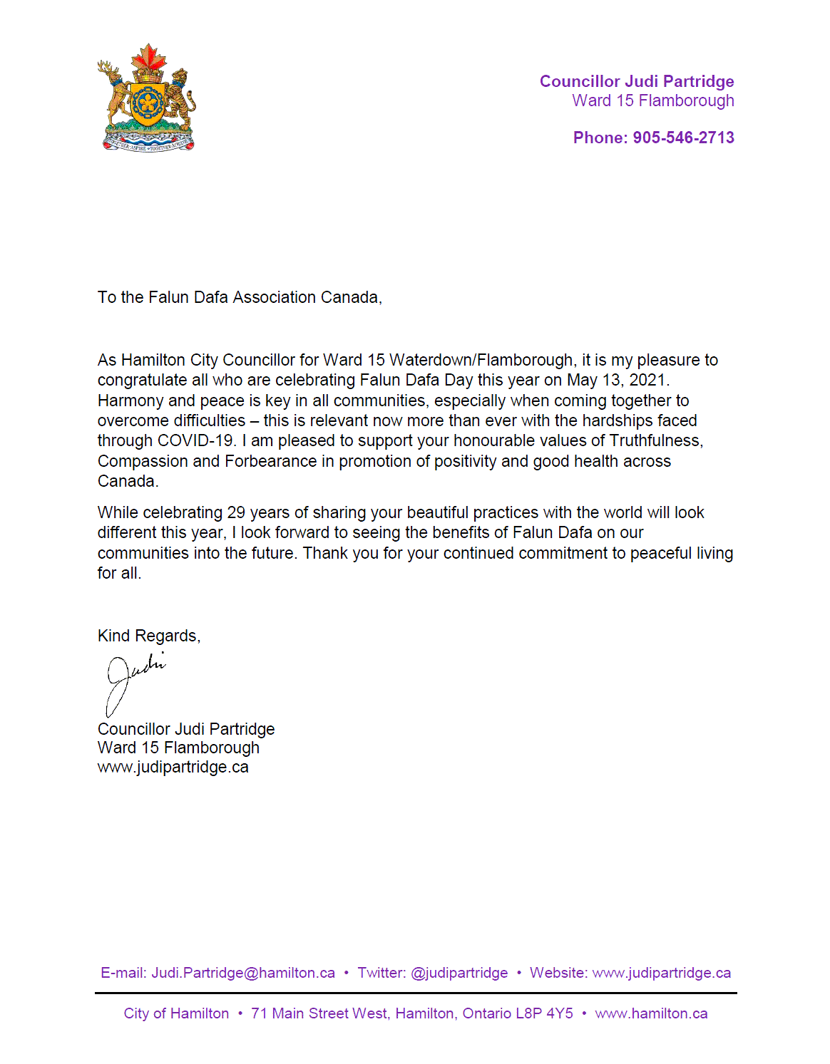 安省漢密爾頓市(Hamilton)市議員朱迪﹒帕特裏奇(Judi Partridge)來信寫道:向所有參與2021年5.13法輪大法日慶典的朋友們送上問候。和諧和平對所有的社區都至關重要,尤其是在共同抵抗疫情的此時此刻。我支持真善忍的高尚信仰,在加拿大各個社區中弘揚健康和積極向上的心態。