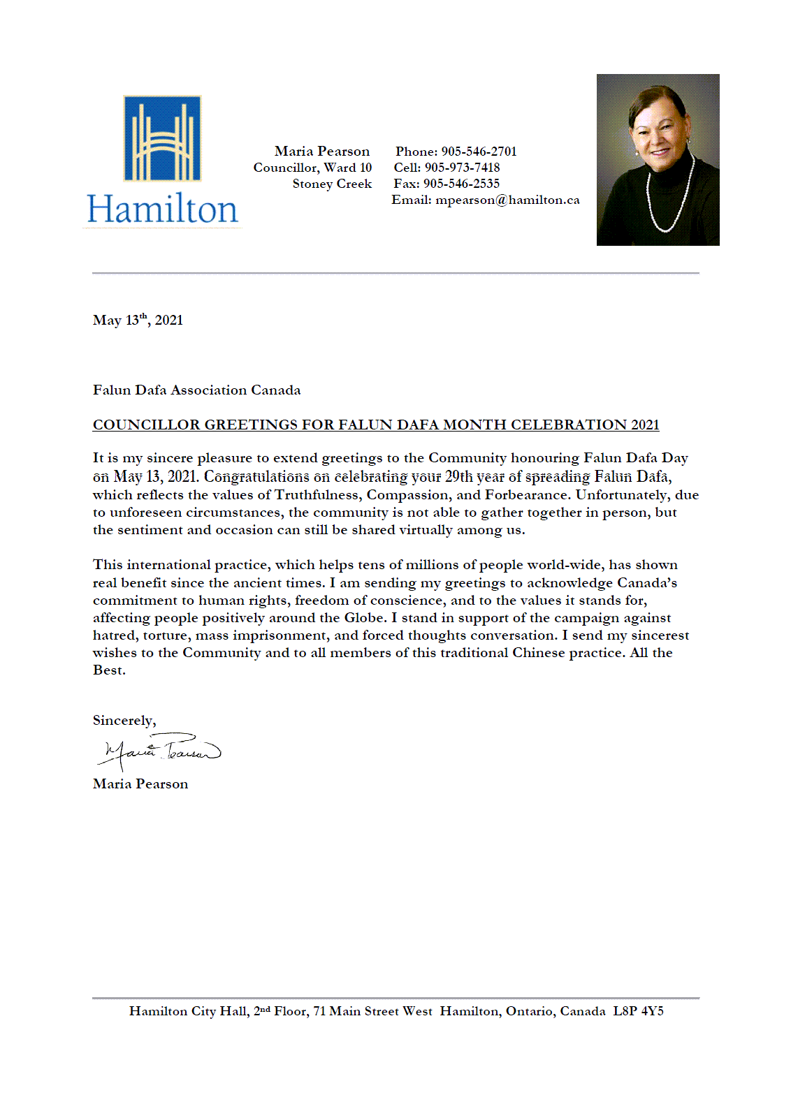 安省漢密爾頓市議員瑪麗亞﹒皮爾森(Maria Pearson)向慶賀2021年5月13日法輪大法日的社區致以最誠摯的問候。祝賀信仰真善忍價值觀的法輪大法傳世29週年。雖然不能歡聚一堂,你們依然可以通過網絡分享慶典的喜悅。