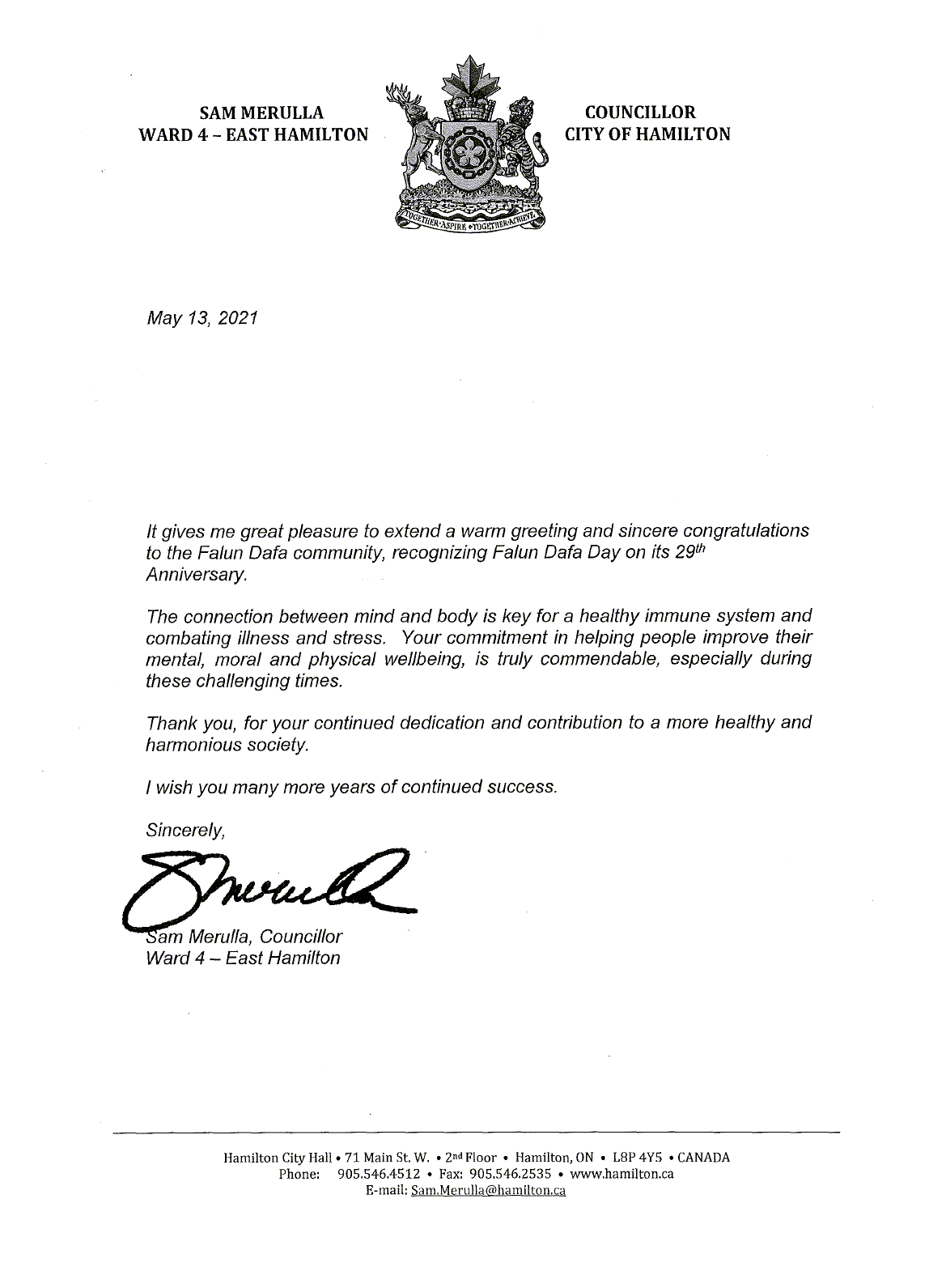 安省漢密爾頓市議員山姆﹒梅魯拉(Sam Merulla)在賀信裏說:值此法輪大法洪傳29年之際,我在此非常高興的向法輪大法社區致以熱烈和誠摯的祝賀!