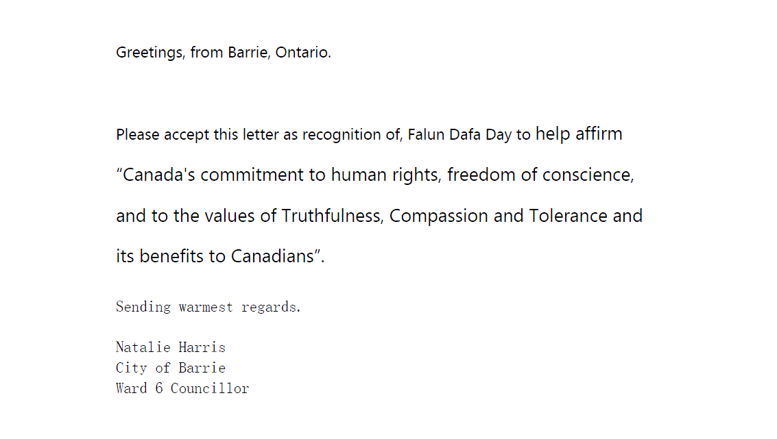 安省巴裏市(Barrie)議員納塔利﹒哈里斯(Natalie Harris)說以此信認可法輪大法日,重申加拿大對人權和信仰自由的承諾,認可真善忍價值觀對加拿大人的益處。