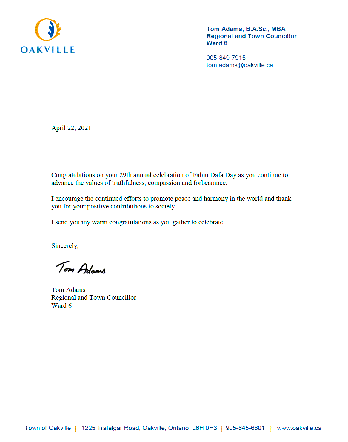 安省奧克維爾市(Oakville)市議員湯姆﹒亞當斯(Tom Adams)賀信寫道:祝賀你們慶祝法輪大法29週年,繼續弘揚真善忍的價值觀。我鼓勵你們持續努力促進世界和平與和諧,並感謝你們為社會做出的積極貢獻。在你們歡聚之時,我向你們致以熱烈的祝賀。