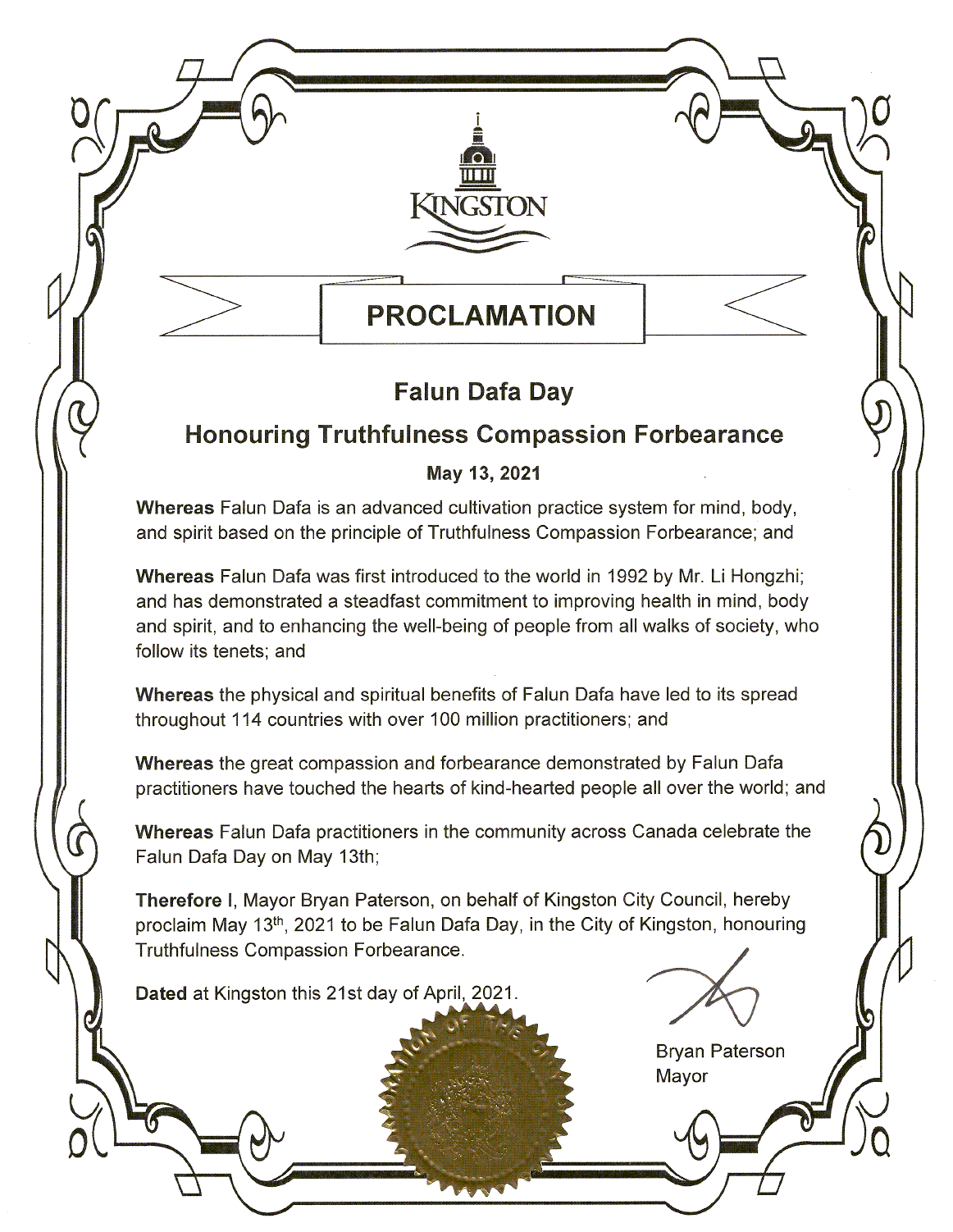 鑑此,我,帕特森市長,褒獎二零二一年五月十三日為法輪大法日,暨表彰真善忍的原則。