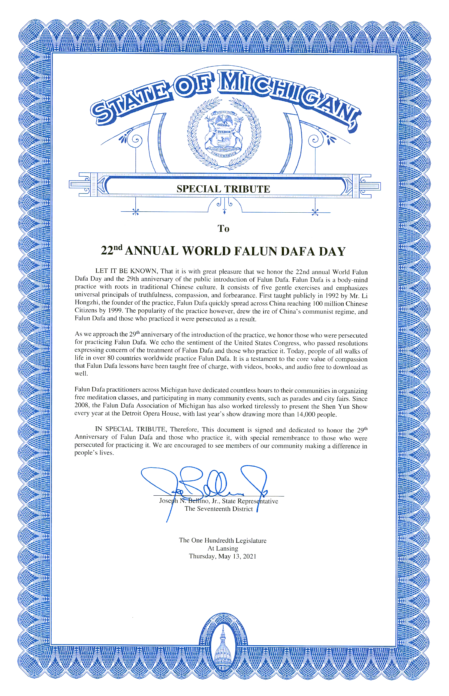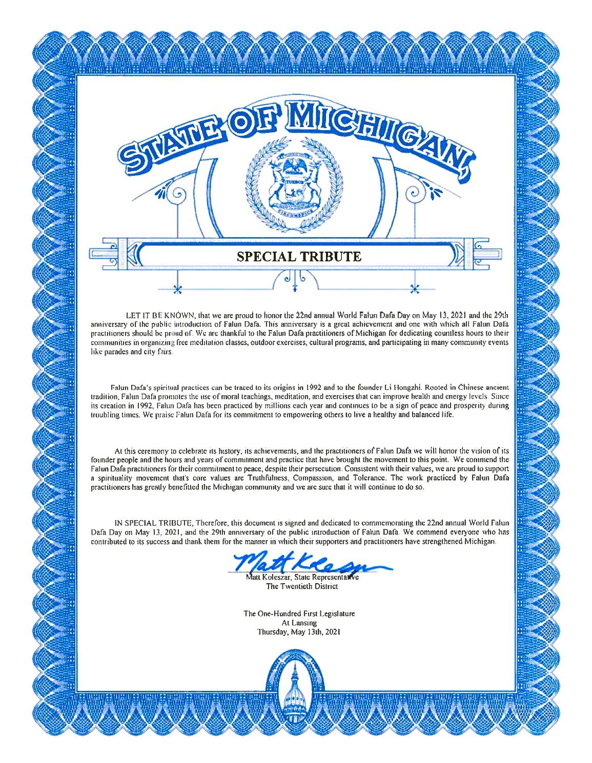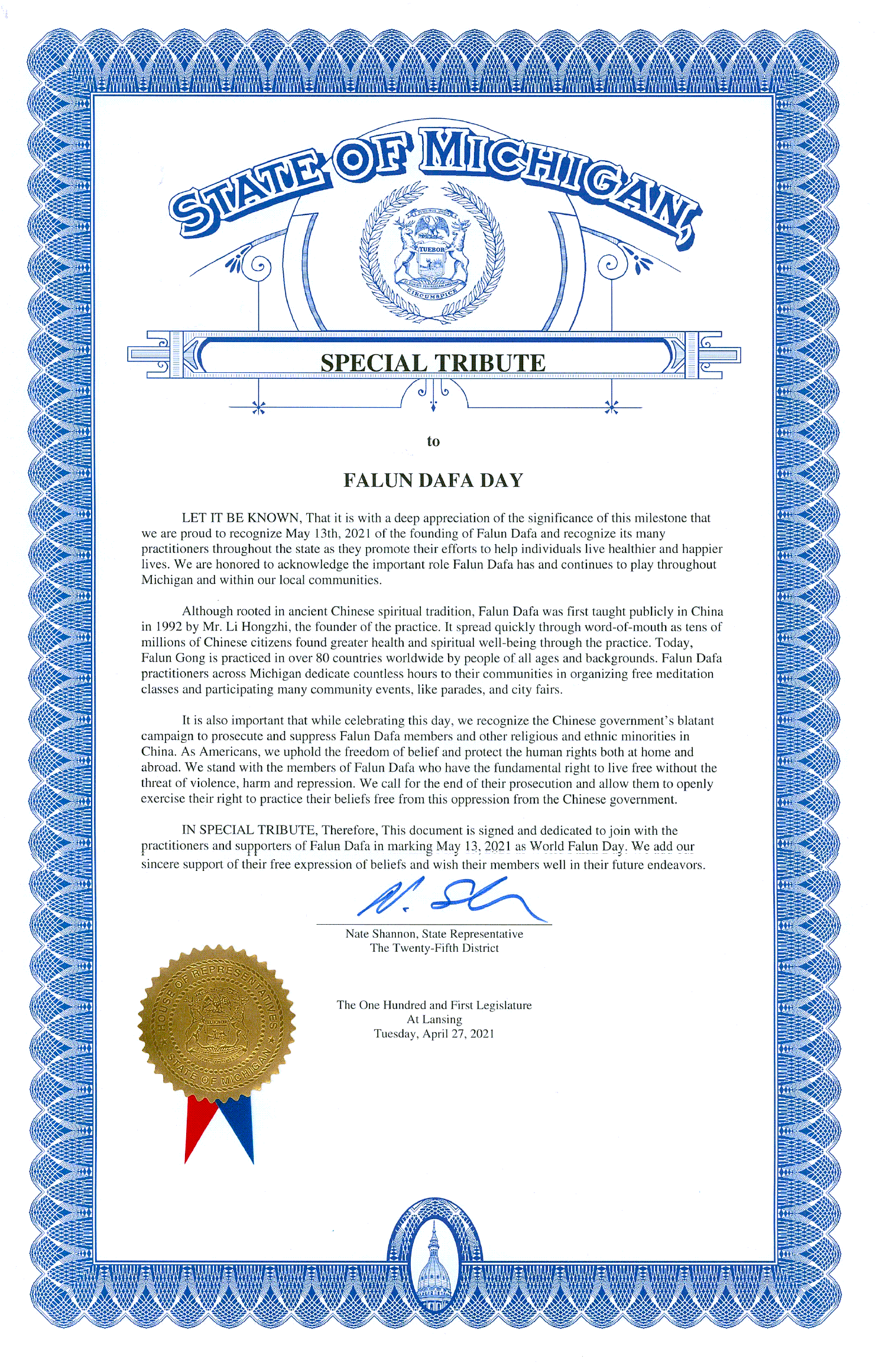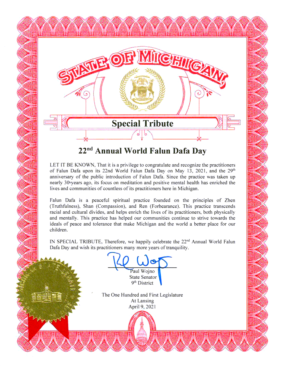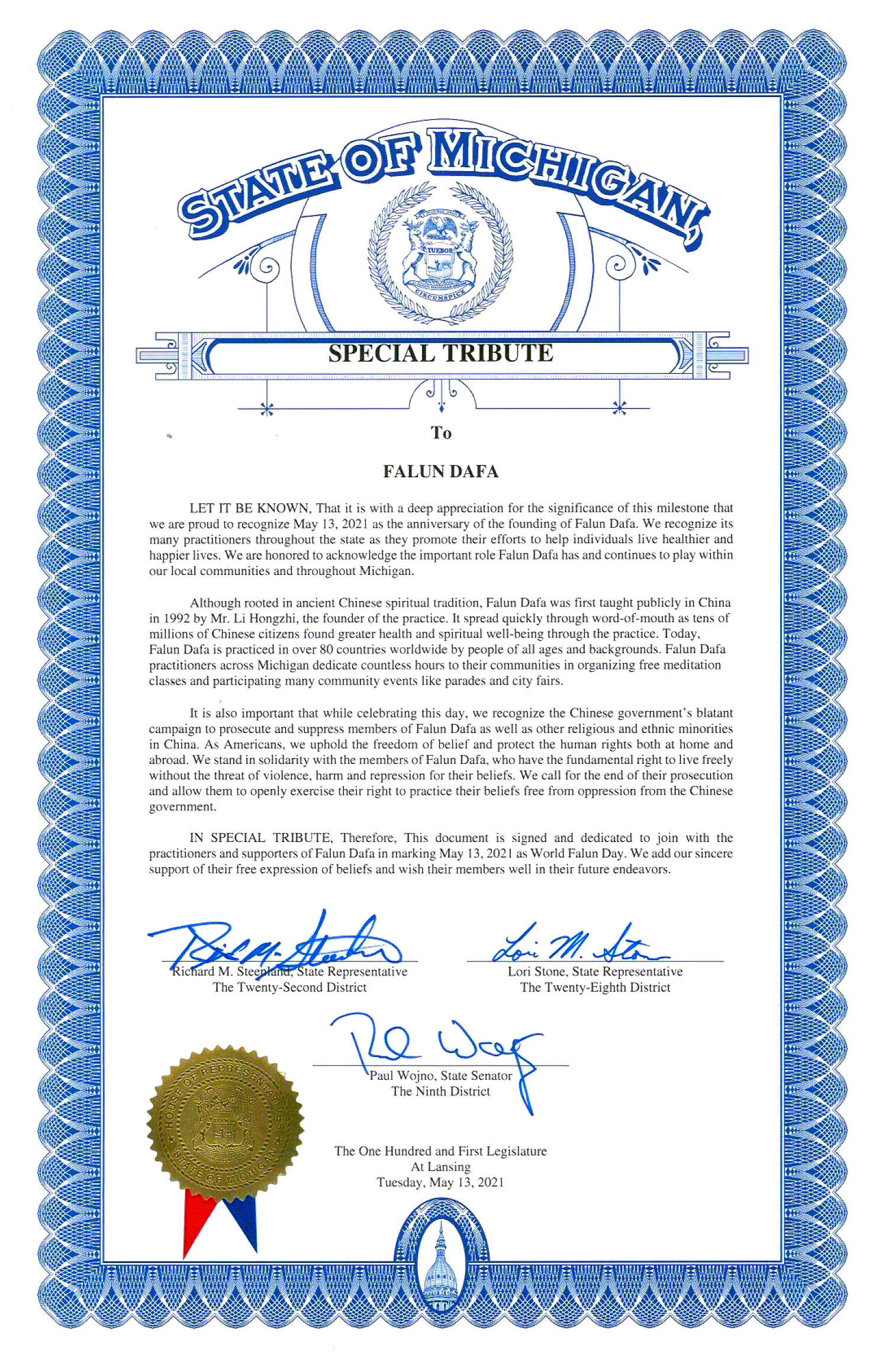 截止到二零二一年五月六日,密西根州法輪大法學會共收到十二位州參、眾議員們的六份特殊褒獎令(Special Tribute)和四份賀信。褒獎信中感謝法輪大法給密西根州社區帶來的積極影響,以及感謝密西根州的法輪功學員為當地居民的無私奉獻。
