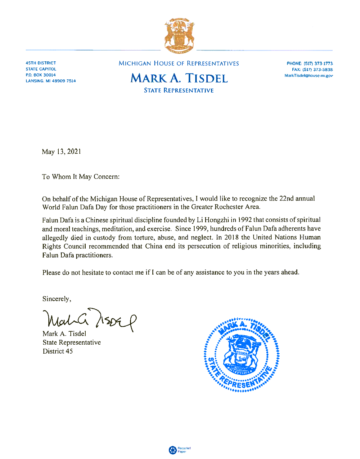 第四十五區州眾議員馬克﹒A﹒提斯德爾(Rep. Mark A. Tisdel)在支持信中說:「然而自1999年以來,在中國大陸數百名法輪大法修煉者們在關押期間死於酷刑、虐待和忽視。2018年,聯合國人權理事會建議中國結束對宗教少數群體的迫害,包括法輪大法學員。如果我在今後的日子裏能為你們提供任何幫助,請不要猶豫,與我聯繫。」