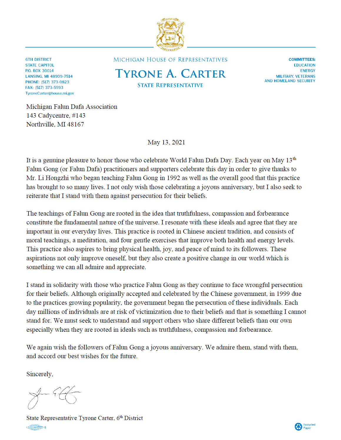 第六區的州眾議員泰隆﹒卡特(Rep. Tyrone Carter)在支持信中說:「我不僅祝願那些慶祝的法輪功修煉者們有一個快樂的周年紀念日,而且我還想重申,我與他們站在一起,反對因其信仰而受到的迫害。」他說:「從1999年開始,由於法輪功越來越受歡迎,中共開始對這些人進行迫害。每天都有數以百萬計的人因為他們的信仰而面臨受迫害的風險,這是我不能容忍的事情。我們必須尋求理解和支持那些與我們的信仰不同的人,尤其是他們的修煉是根植於真、善、忍。」