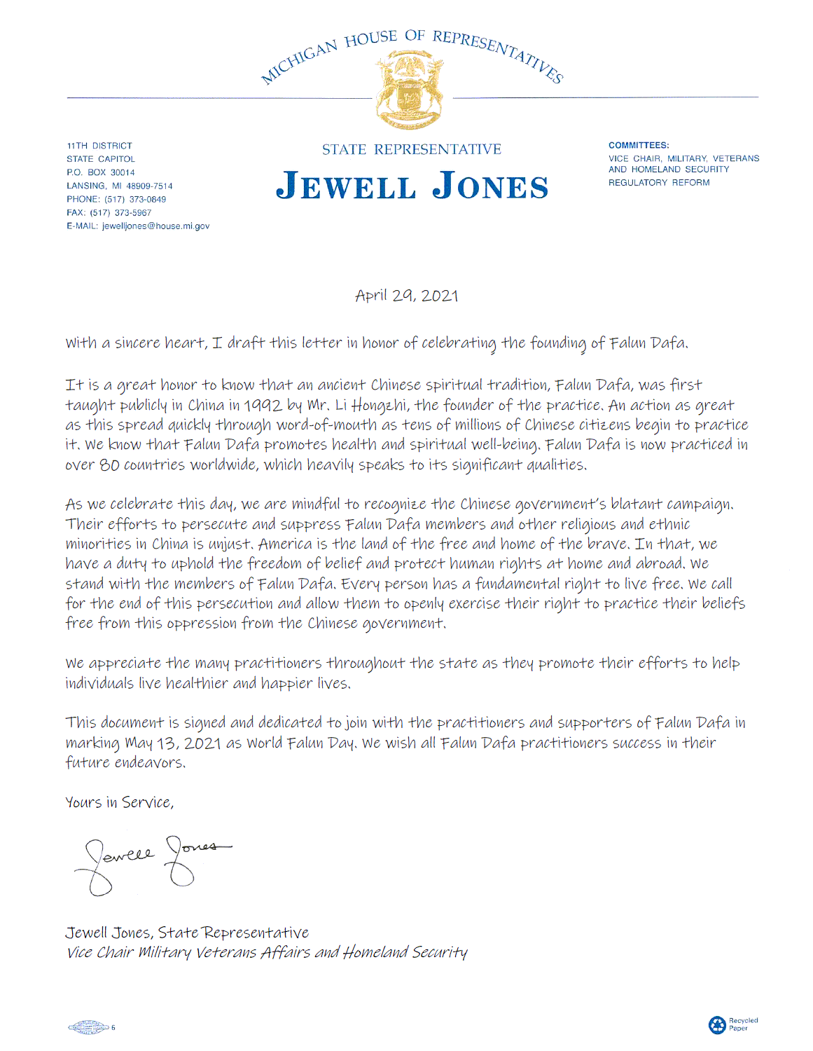第十一區州眾議員朱厄爾﹒瓊斯(Jewell Jones)也是退伍軍人事務部和國土安全部副主席,在他的賀信中提到:「美國是自由的國度和勇敢者的家園。在這一點上,我們有責任維護信仰自由,保護國內外的人權。我們與法輪大法的學員站在一起。每個人都有自由生活的基本權利。我們呼籲結束這種迫害,允許他們公開行使自己的權利,在沒有政府的壓迫下擁有自己的信仰。 」
