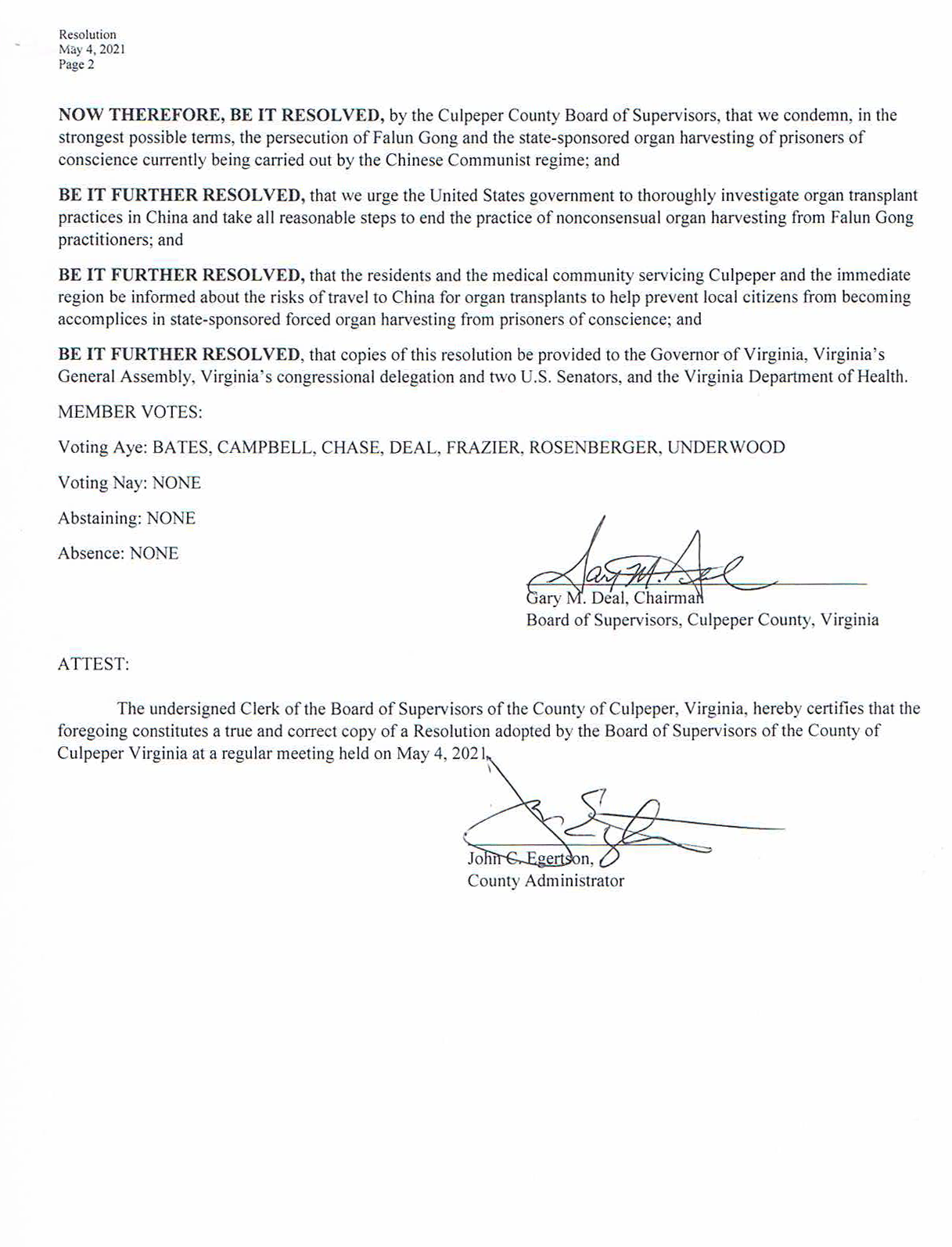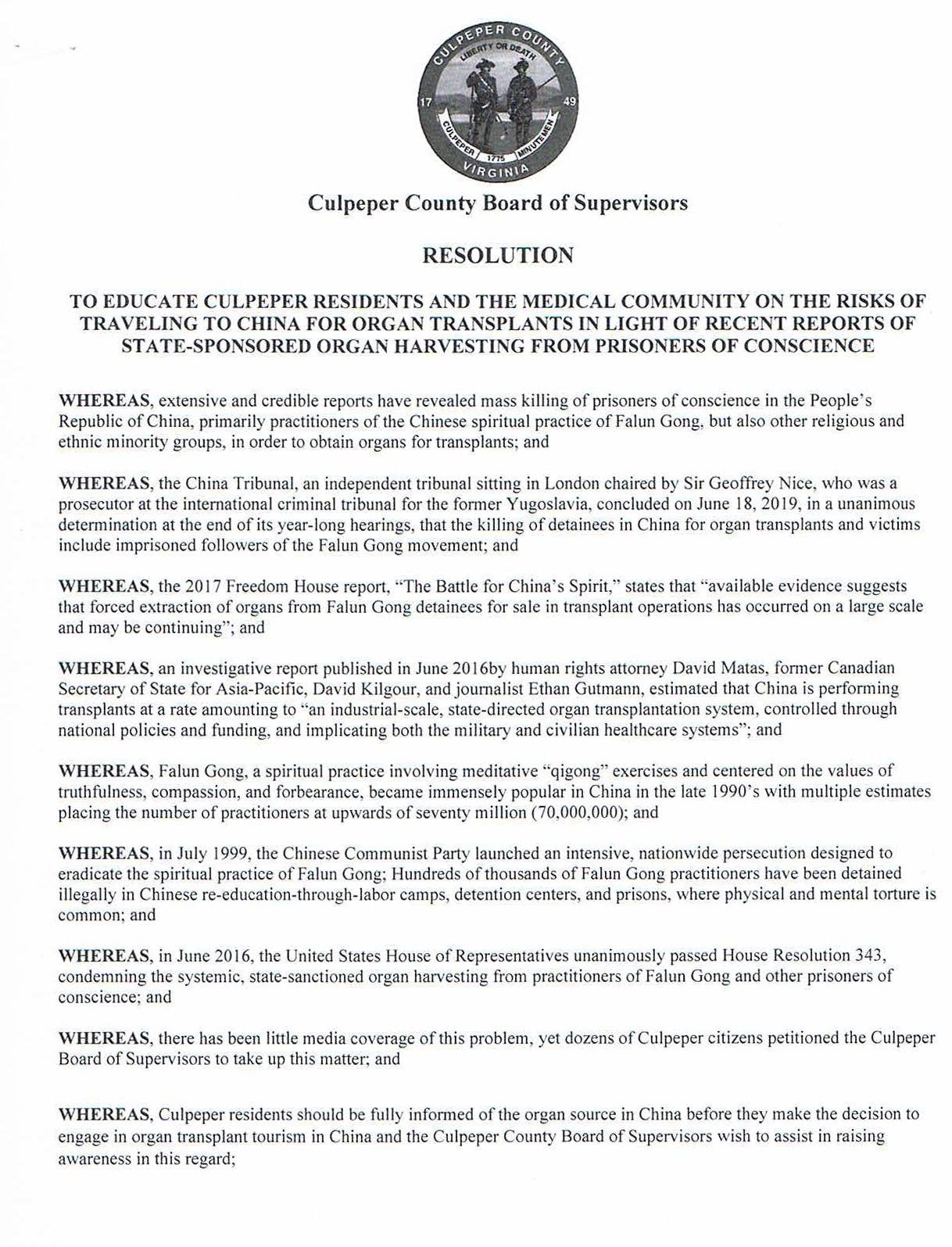 決議案還表示, 將「通知庫爾佩珀縣和附近地區的居民和醫療界,有關前往中國進行器官移植的風險,以幫助制止居住在當地的公民無意間成為(中共)國家認可的活摘良心犯器官行徑的共謀。」