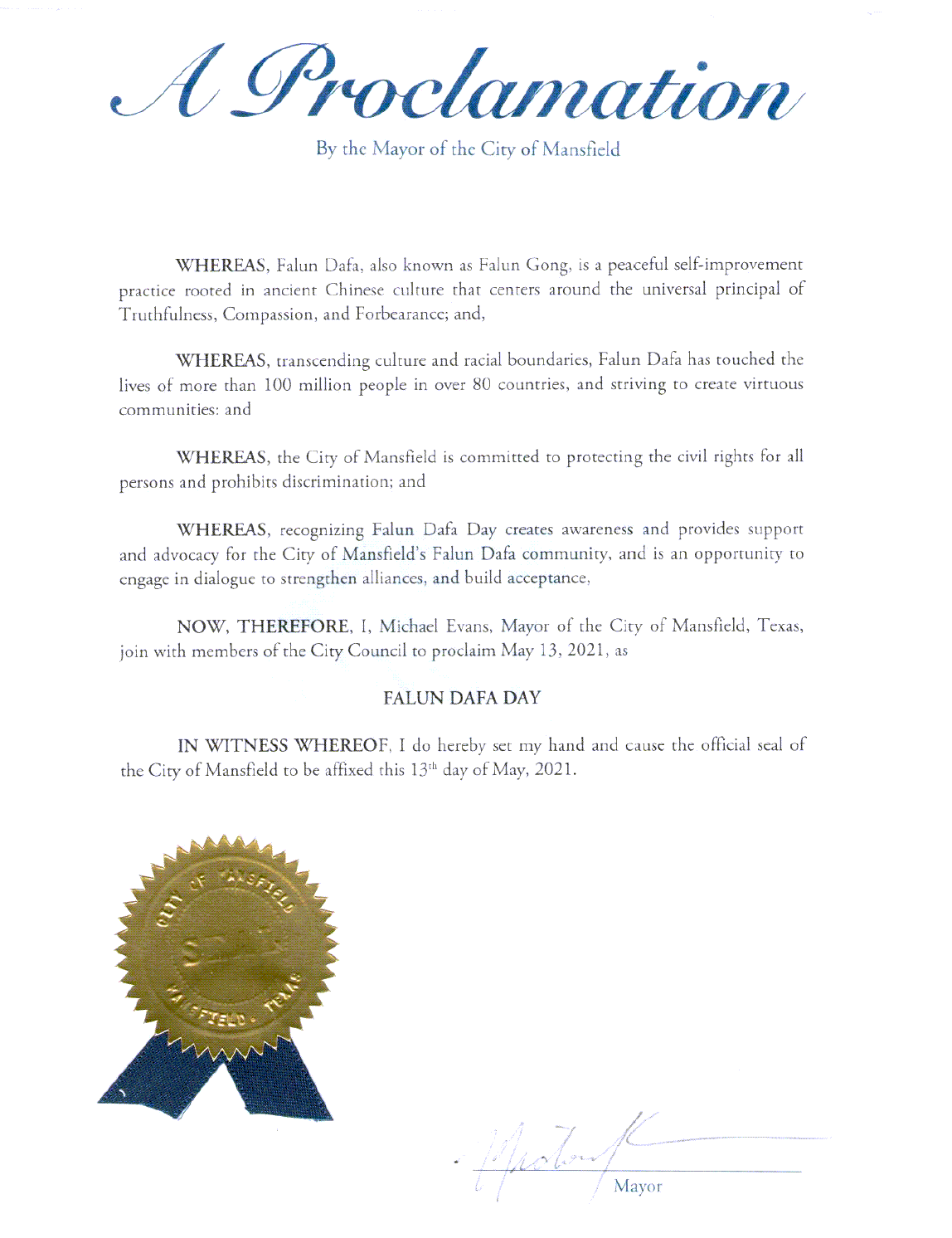 鑑於,讚賞法輪大法能為曼斯菲爾德市的法輪大法社團創造認知、提供支持和倡導的作用,並且能讓增強團結和建立接受度;