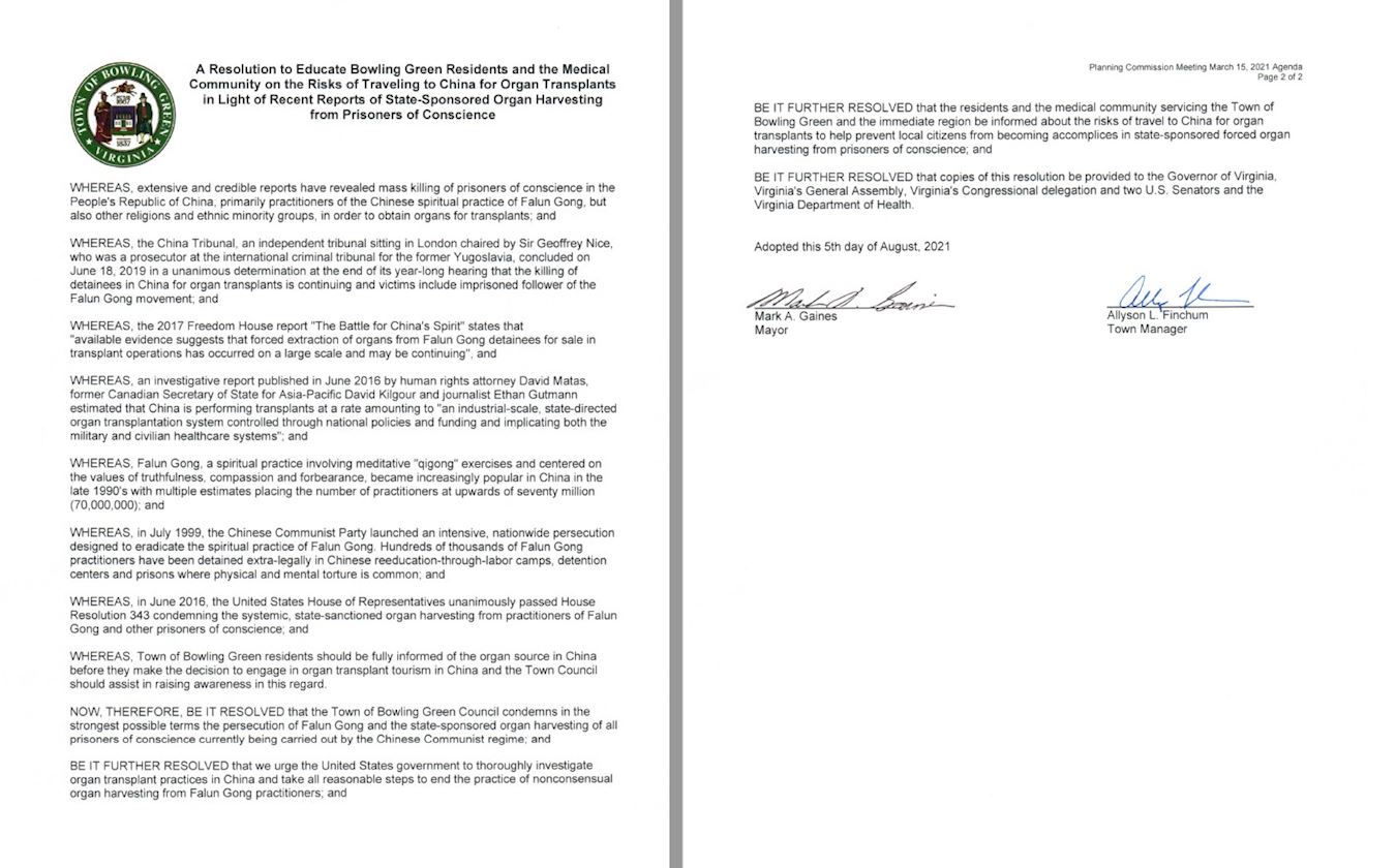 根據決議案,鮑靈格林鎮議會將通知所在鎮和附近地區的居民和醫療界,「有關前往中國進行器官移植的風險,以幫助制止居住在當地的公民無意間成為(中共)國家認可的活摘良心犯器官行徑的共謀」。