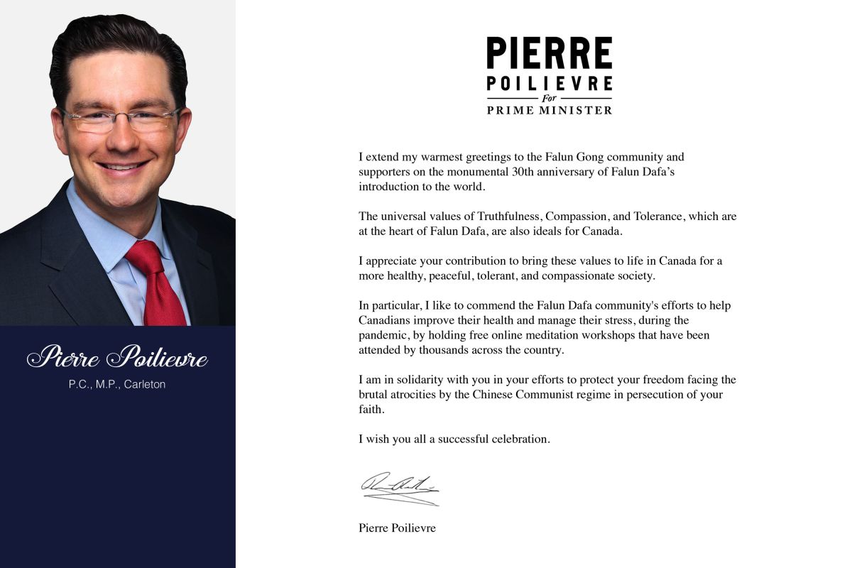 總理和保守黨黨魁候選人、保守黨影子內閣財政部長、卡爾頓(Carleton)選區國會議員皮埃爾﹒鮑利夫(Pierre Poilievre)發來賀信向「法輪功學員和支持者致以最熱烈的問候。」