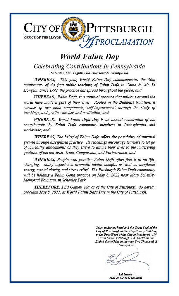 鑑於此,我,匹茲堡市市長,Ed Gainey,在此宣布二零二二年五月八日是匹茲堡市的世界法輪大法日。