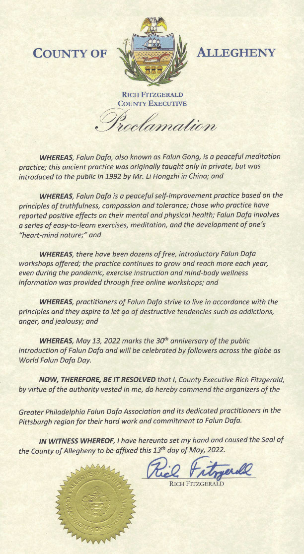 鑑於此,我,阿勒格尼縣行政長官裏奇﹒菲茨傑拉德(Rich Fitzgerald)在此表彰大費城法輪大法學會以及匹茲堡地區盡心的法輪大法修煉者的辛勤努力和奉獻。