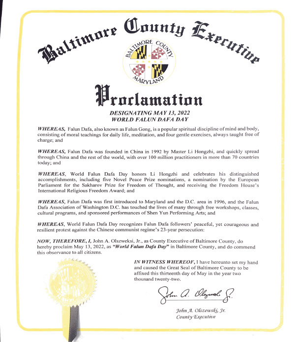 ![]() 馬裏蘭州巴爾的摩郡郡長小約翰﹒奧爾澤沃斯基頒發褒獎令,定二零二二年五月十三日為巴爾的摩郡「世界法輪大法日」。 |
