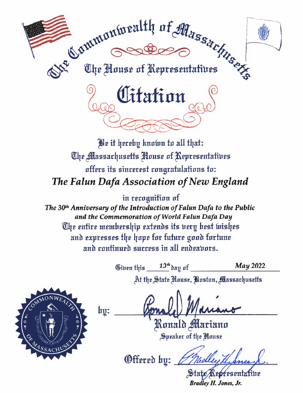 謹在此公布:麻薩諸塞州眾議院恭祝新英格蘭法輪大法協會、祝賀法輪大法洪傳三十週年並慶賀法輪大法日。全體議員向你們傳達最佳祝福,希望諸事好運,持續成功。
