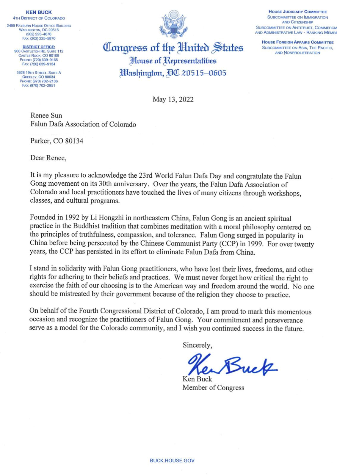 我代表科羅拉多州第四國會選區,自豪地紀念這一重要時刻, 認可法輪功學員。你們的承諾和堅持作為科羅拉多社區的典範,我希望你們在未來繼續取得成功。