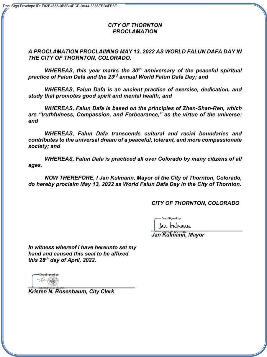 因此, 我科羅拉多州桑頓市市長揚﹒庫爾曼特此宣布:2022年5月13日在桑頓市為世界法輪大法日。