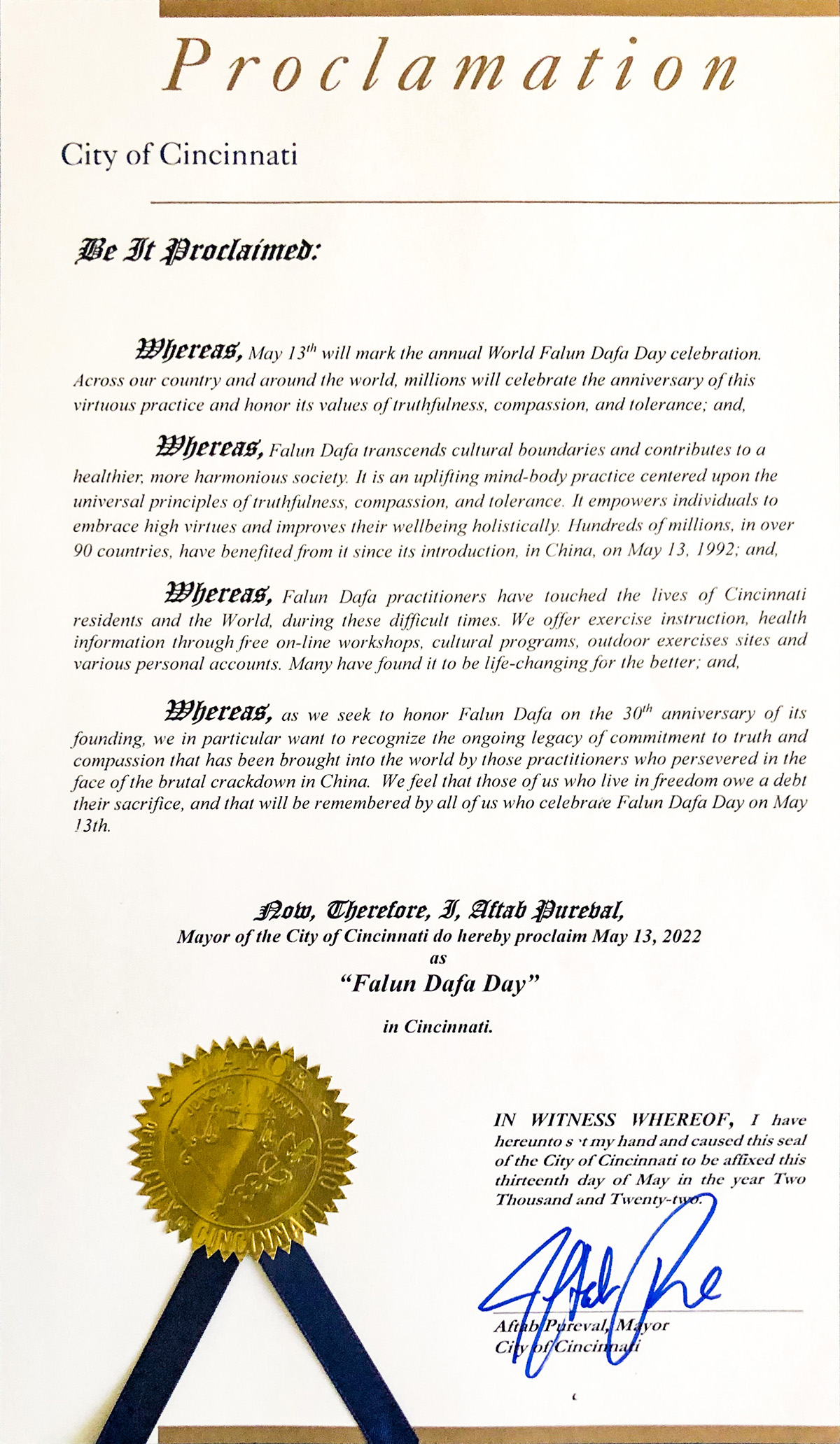 ![]() 圖:辛辛那提市市長阿夫塔布﹒皮爾沃(Aftab Pureval)頒發褒獎宣布二零二二年五月十三日為辛辛那提「法輪大法日」。 |