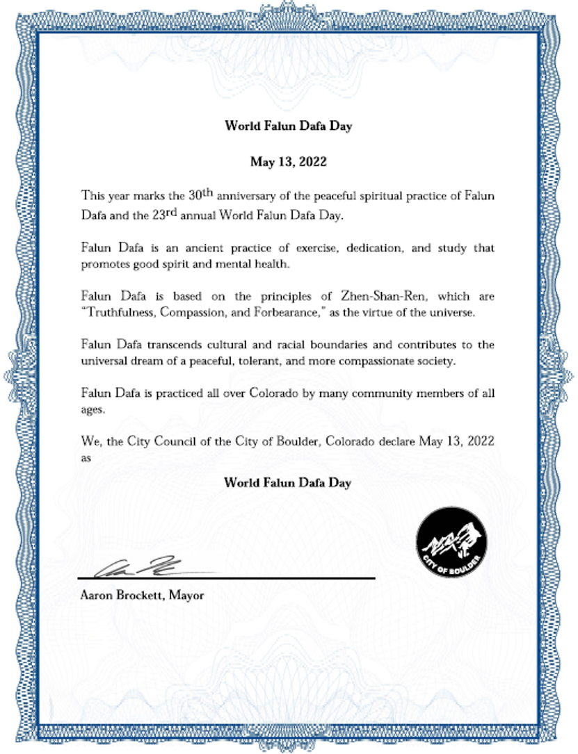 我們科羅拉多州博爾德市市議會宣布2022年5月13日為世界法輪大法日。